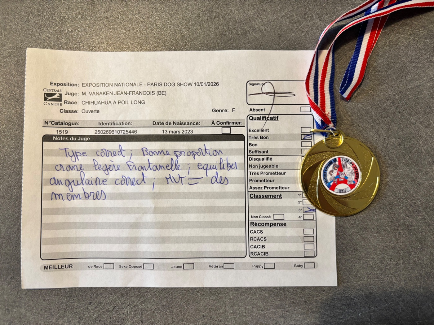 Ura : « type correct, bonne proportion crâne, légère fontanelle, équilibre angulaire correct, mouvement parallèle des membres »