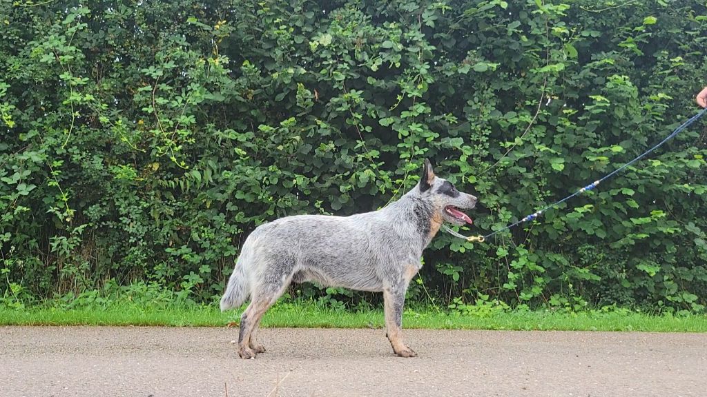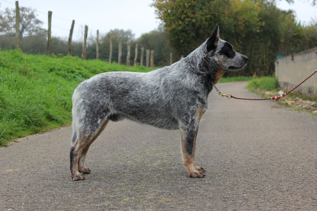 Jolie Sujet, Excellent Type, Belle Tête, Bel oeil et Belles Oreilles, un petit peu de Fanion. Excellente Encolure et Ligne de Dessus. Excellente Croupe et Fouet, Excellentes Cuisses et Jarrets. Poitrine Correcte pour son âge. Excellente Pigmentation. Excellents Pieds. Démarche et Mouvement Corrects. Problème Positionnement Canines Inférieures (se qui lui a valu le qualificatif Assez Prometteur)