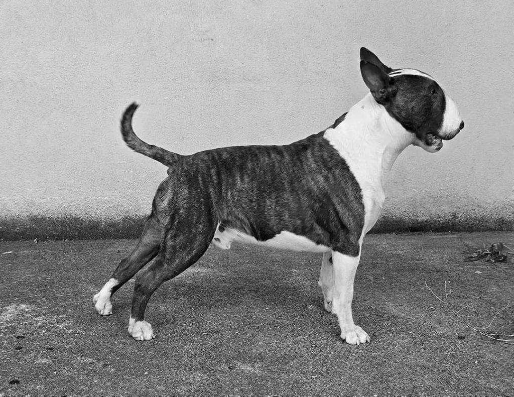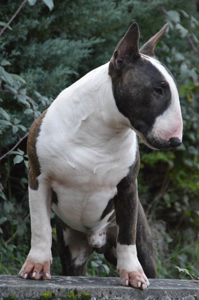 2.5 Jahre, brindle mit weiss, korrekti in allen TEilen, starker Kopf, dem es etwas an Länge fehit, Scherengebiss, gutes downface, korr. Ohr, gute obere Linie, Rute etwas hoch angesetzt und getragen, vorz. Knochenstärke, korr Pfoten, genügend gewinkelte Hinterhand, hinten etwas eng, bewrgt sich flott aber verliert die obere Linie in der Bewegung