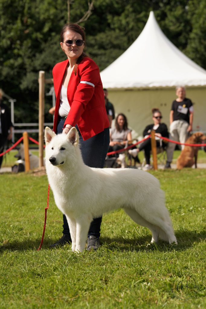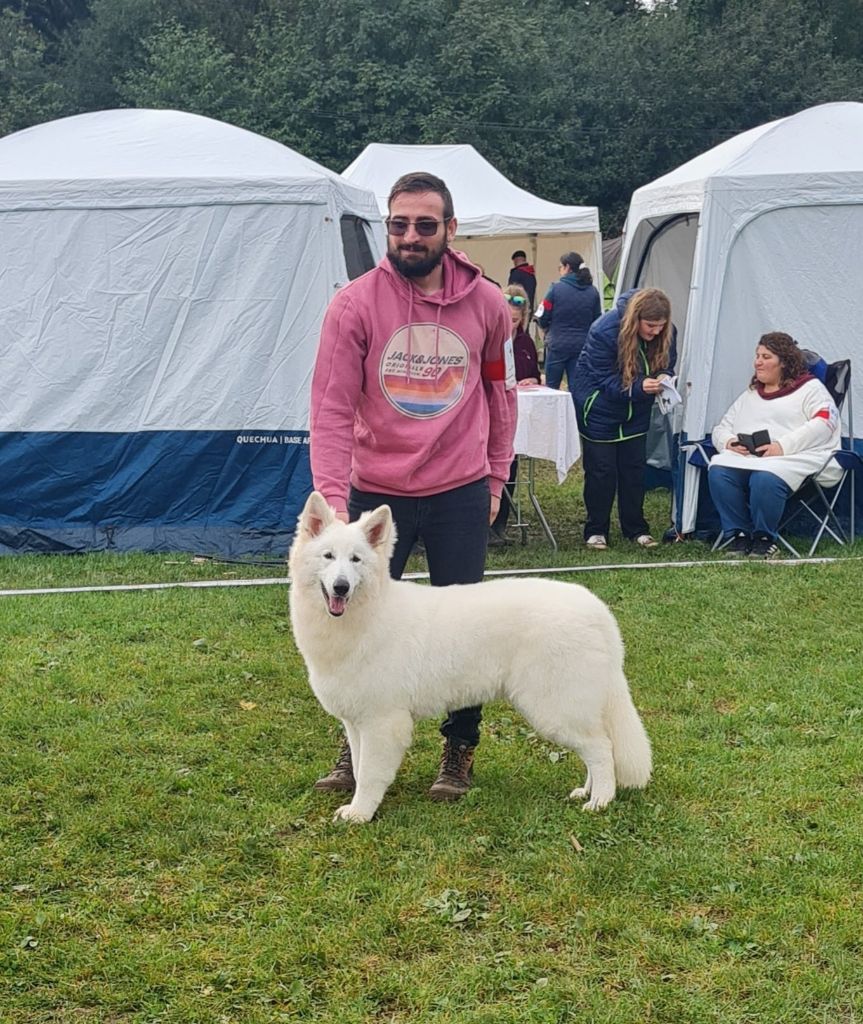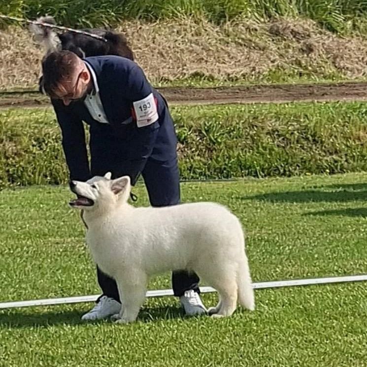 Tête uniforme, Dentition latérale OK, un peu timide en 2 tempsTête: Crâne en formation, Excellent oeil un peu rond mais foncé, Excellente proportion crâne/chanfrein, Oreille pourrait être porté plus haute mais excellente longueur, Excellent format.Corps: Poitrail doit se faire, Jarret un peu court, Très bonne proportion, Grasset bien dessiné.Mouvement: Excellent mouvement, fouet et structureChien à revoir finit