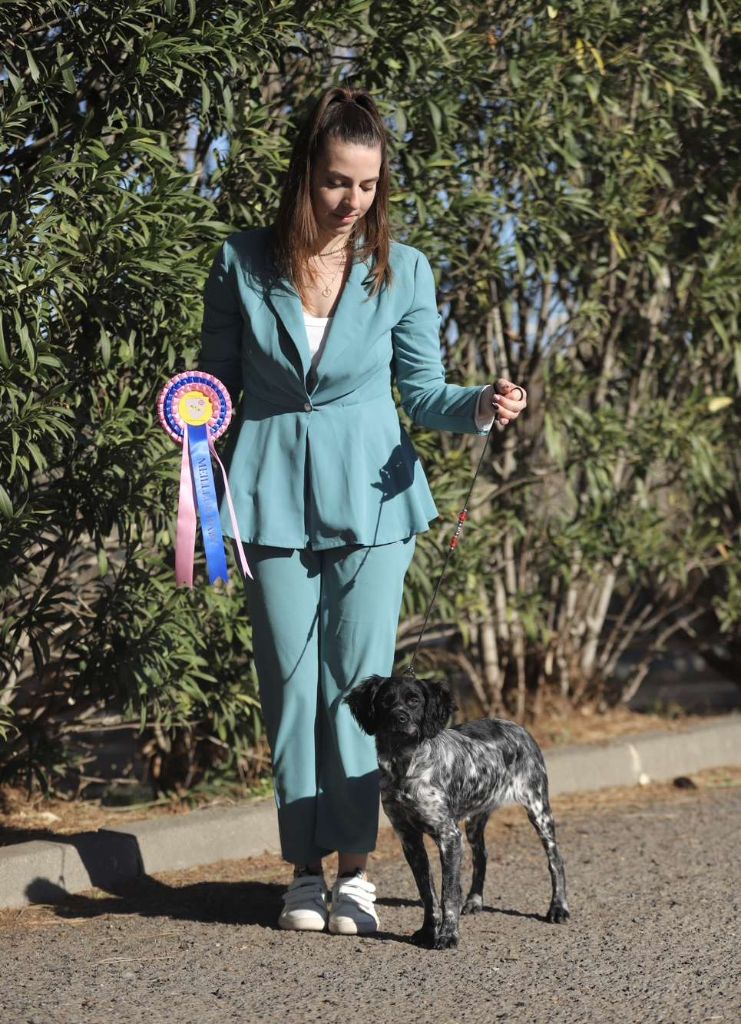 48cm. Dentition complète. Très jolie sujet, bien construite, excellent ossature bien angulée excellente tête avec expression bretonne excellent oeil, rapport chanfrein, crâne et oreilles jolie encolure line de dessus joliepoitrine deja bien descendue angulation suffisante excellent pieds excellente robe, pigmentation et texture très joli mouvement