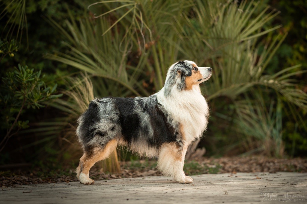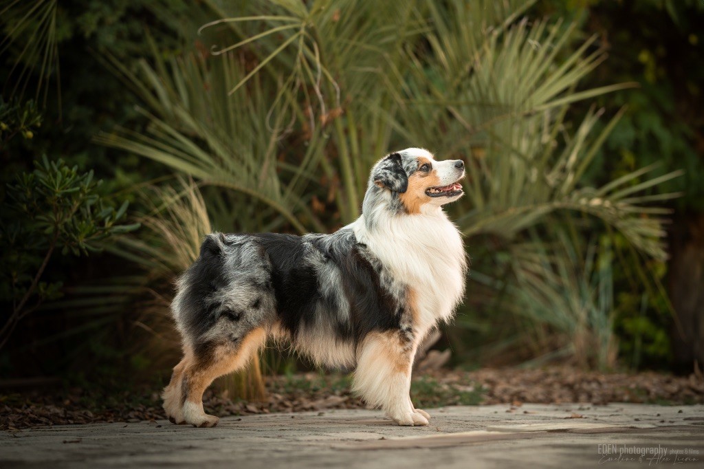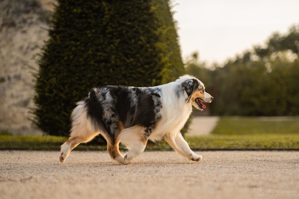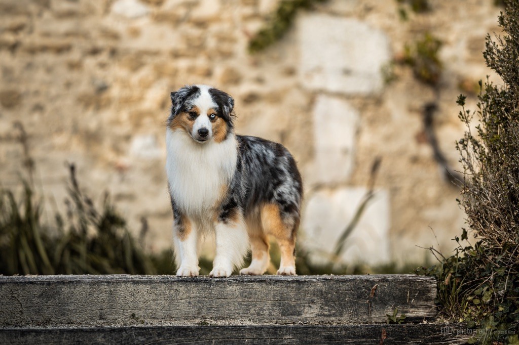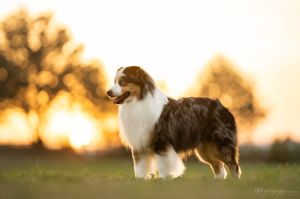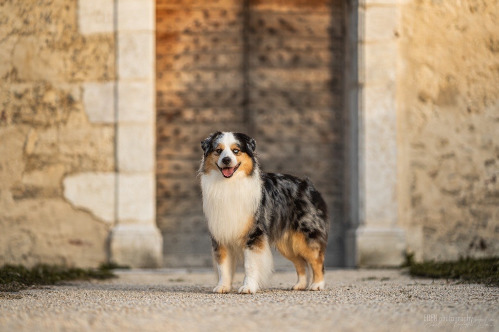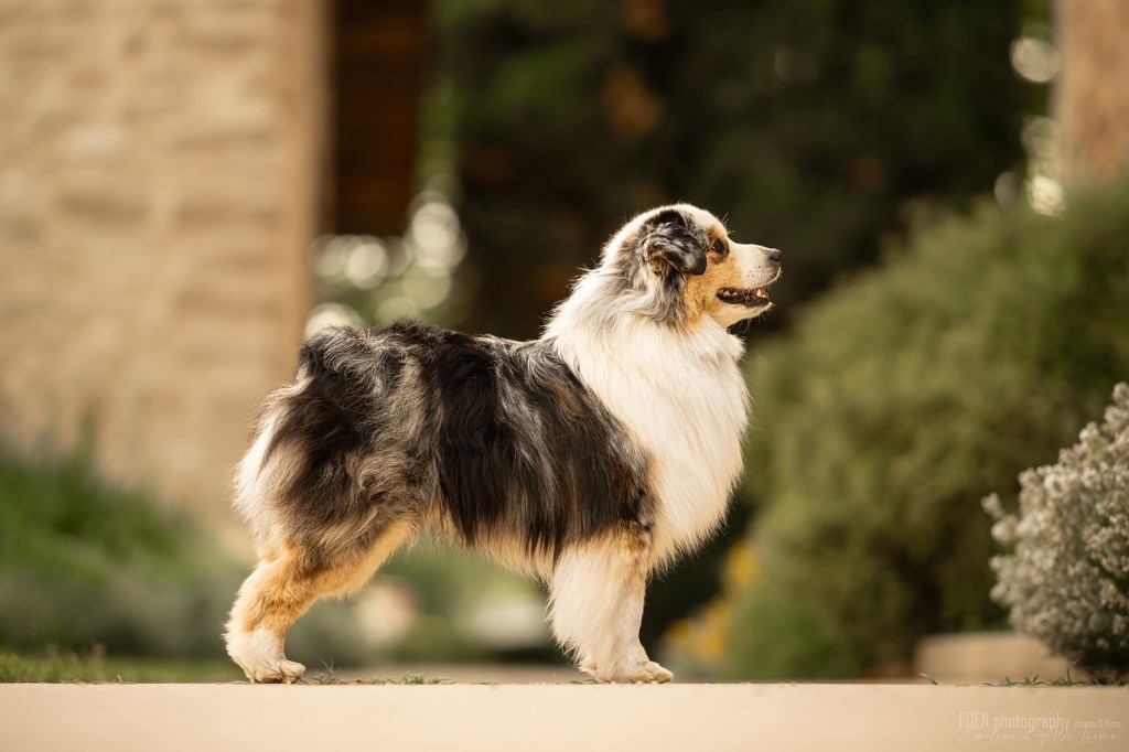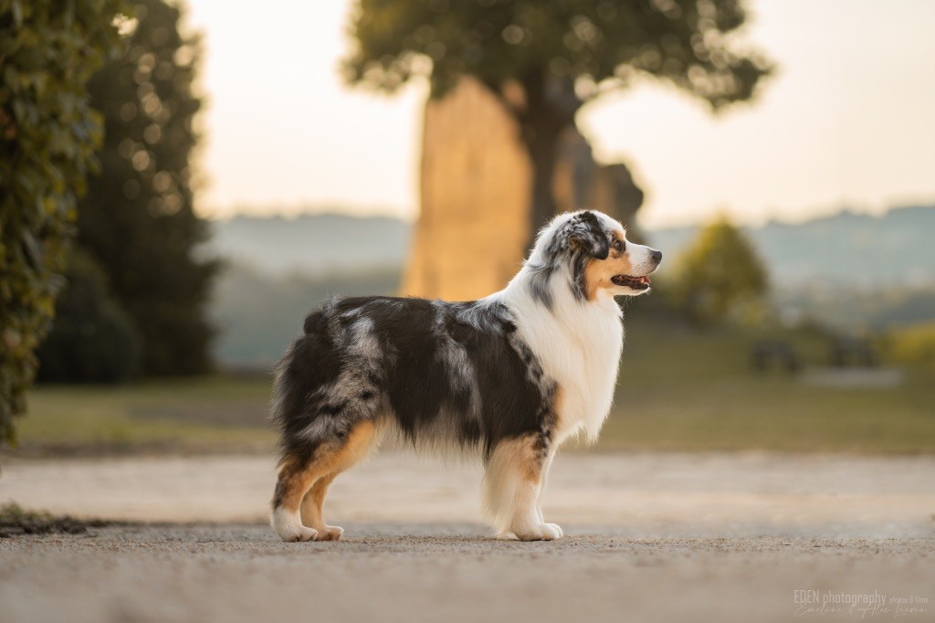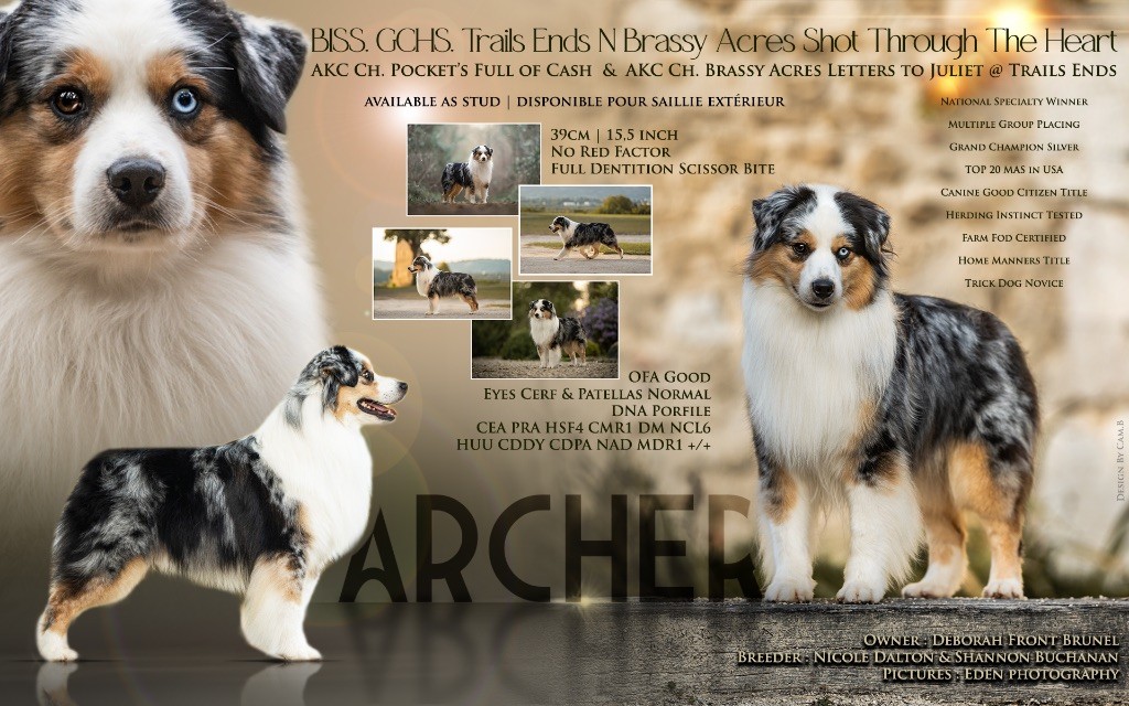 Nous sommes très heureux de vous présenter Archer, notre nouveau mâle arrivé en août 2023 d'Arizona. Toujours autant d'émotions que d'aller récupérer un import.. mais je dois dire que je me souviendrai toujours de ce jour là !!! Archer a beaucoup de prestance, il dégage vraiment quelque chose de wow !!! Et quand je l'ai aperçu au loin à la gare, mon coeur a fait boummmmQuelle rencontre ..INOUBLIABLENous remercions donc son éleveuse Nicole Dalton pour nous faire confiance une seconde fois, puisqu'Archer vient du même élevage que Billy. Il est au dessus de nos espérances, mille merci !Archer, c'est un petit chien complet. Il a tout pour plaire : la beauté & le tempérament Physiquement, c'est un petit chien de 39,5 cm, plutôt petit pour un mâle, avec beaucoup d'ossature, d'excellents aplombs, plutôt court de dos, une magnifique sortie d'encolure, d'excellentes angulations avant et arrières, et surtout un mouvement extraordinaire ! Ce chien flotte avec beaucoup de prestance. Quand à sa tête, ses yeux vairons en amande lui donnent une expression pleine de douceur et d'amour, ses oreilles sont de bonnes tailles, de bonnes formes et bien implantées. Son collier blanc complet met en valeur sa superbe encolure et son avant main vraiment chouette. J'adore également ses pattes de chat.Et côte caractère : c'est une CREME de petit chien !!!! Ma priorité avant toute chose ici, je suis donc combléeDifficile de rêver mieux, il est facile à vivre, sociable avec tous les congénéres, joueur, hyper affectueux, Archer vous tombera dans les bras pour se blottir contre vous, c'est mon premier chien qui aime réellement faire des câlins de la sorte, il ne connait pas les inconnus, tous les humains sont ses copains, il est très gourmand, donc facile pour l'apprentissage, il adore les enfants, il voyage super bien en voiture, il aime se faire toiletter, en balade il a un parfait rappel et en maison il est d'un calme olympien ! Un p'tit chien très malléable, qui est vite devenu mon ombre .... Il me suit de partout, on s'adore mutuellement, un énorme coup de coeur.Il a eu un chouette parcours aux USA en remportant de nombreux titres de beauté. Archer est devenu champion américain et grand champion silver. Il figure dans le top 20 des bergers américains aux USA. Il a aussi réussi de nombreux titres comme le canine good citizen, le travail sur troupeau, il est Farm dog certifié et trick dog novice.Un très joli palmarès pour notre adorable Archer.Il laisse derrière lui de nombreux bébés tous aussi beaux que lui, et de nombreux champions dans sa production.Maintenant nous sommes impatients de découvrir ce que l'avenir nous réserve avec notre joli garçon et d'ouvrir ce nouveau chapitre en France...