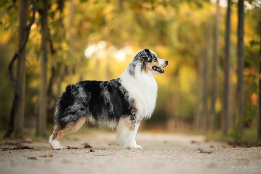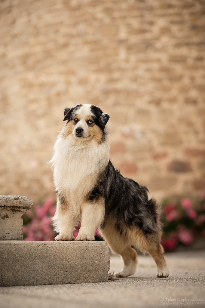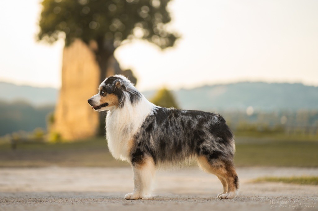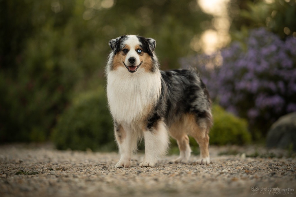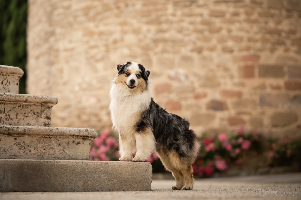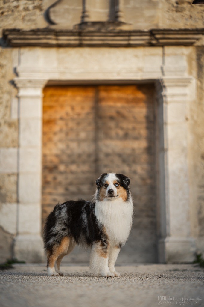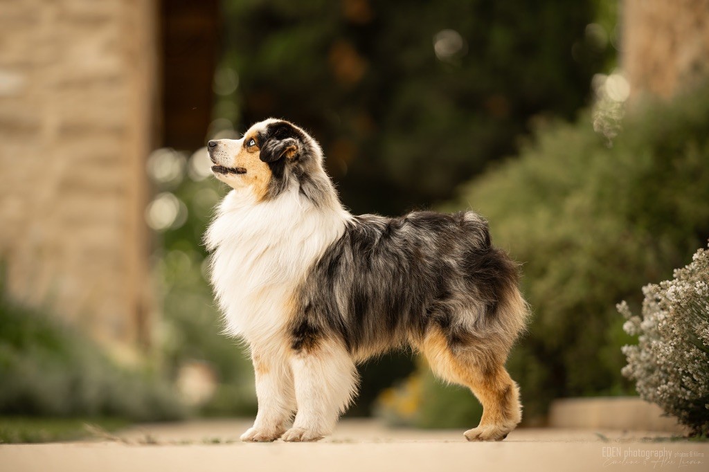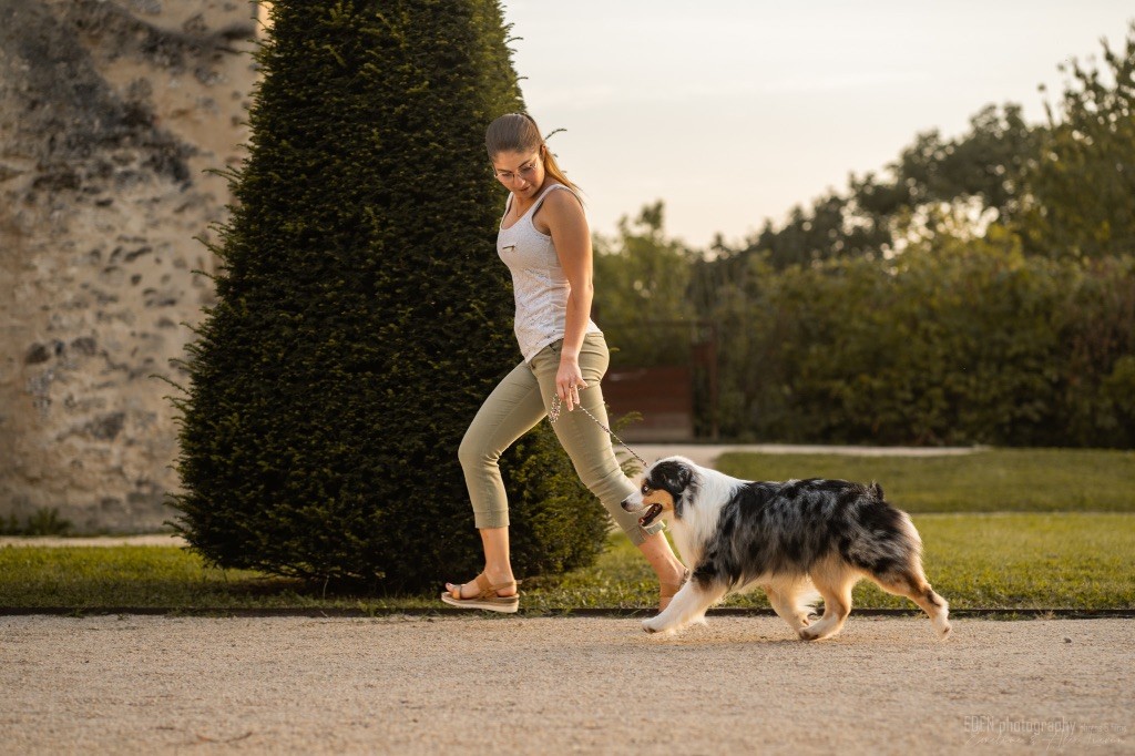 Nous sommes très heureux de vous présenter Archer, notre nouveau mâle arrivé en août 2023 d'Arizona. Toujours autant d'émotions que d'aller récupérer un import.. mais je dois dire que je me souviendrai toujours de ce jour là !!! Archer a beaucoup de prestance, il dégage vraiment quelque chose de wow !!! Et quand je l'ai aperçu au loin à la gare, mon coeur a fait boummmmQuelle rencontre ..INOUBLIABLENous remercions donc son éleveuse Nicole Dalton pour nous faire confiance une seconde fois, puisqu'Archer vient du même élevage que Billy. Il est au dessus de nos espérances, mille merci !Archer, c'est un petit chien complet. Il a tout pour plaire : la beauté & le tempérament Physiquement, c'est un petit chien de 39,5 cm, plutôt petit pour un mâle, avec beaucoup d'ossature, d'excellents aplombs, plutôt court de dos, une magnifique sortie d'encolure, d'excellentes angulations avant et arrières, et surtout un mouvement extraordinaire ! Ce chien flotte avec beaucoup de prestance. Quand à sa tête, ses yeux vairons en amande lui donnent une expression pleine de douceur et d'amour, ses oreilles sont de bonnes tailles, de bonnes formes et bien implantées. Son collier blanc complet met en valeur sa superbe encolure et son avant main vraiment chouette. J'adore également ses pattes de chat.Et côte caractère : c'est une CREME de petit chien !!!! Ma priorité avant toute chose ici, je suis donc combléeDifficile de rêver mieux, il est facile à vivre, sociable avec tous les congénéres, joueur, hyper affectueux, Archer vous tombera dans les bras pour se blottir contre vous, c'est mon premier chien qui aime réellement faire des câlins de la sorte, il ne connait pas les inconnus, tous les humains sont ses copains, il est très gourmand, donc facile pour l'apprentissage, il adore les enfants, il voyage super bien en voiture, il aime se faire toiletter, en balade il a un parfait rappel et en maison il est d'un calme olympien ! Un p'tit chien très malléable, qui est vite devenu mon ombre .... Il me suit de partout, on s'adore mutuellement, un énorme coup de coeur.Il a eu un chouette parcours aux USA en remportant de nombreux titres de beauté. Archer est devenu champion américain et grand champion silver. Il figure dans le top 20 des bergers américains aux USA. Il a aussi réussi de nombreux titres comme le canine good citizen, le travail sur troupeau, il est Farm dog certifié et trick dog novice.Un très joli palmarès pour notre adorable Archer.Il laisse derrière lui de nombreux bébés tous aussi beaux que lui, et de nombreux champions dans sa production.Maintenant nous sommes impatients de découvrir ce que l'avenir nous réserve avec notre joli garçon et d'ouvrir ce nouveau chapitre en France...