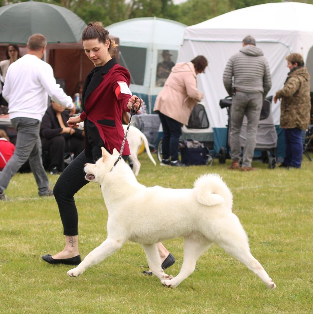 3 ans et demi, Jolie chienne blanche, pigmentation de la truffe en rapport avec sa robe, yeux de bonne forme, couleur correcte par rapport à sa robe, oreilles bien implantées et inclinées vers l'avant, TB encolure, TB ligne dessus / dessous, fouet bien porté mais pourrait être attaché un peu plus haut, joli pied de chat, bonne qualité de poil, mouvement facile et régulier, excellent caractère et excellente présentation