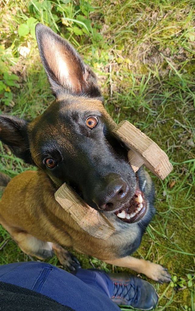 Note du juge :Dentition complète en ciseaux ; Fauve bien charbonnéBon stop en tête ; Bon masqueOreilles légèrement claires ; Oreilles bien portées longuesEncolure cylindriqueConstruction un peu longueBonne angulation et ossature ; Bon aplombAllures à retravailler