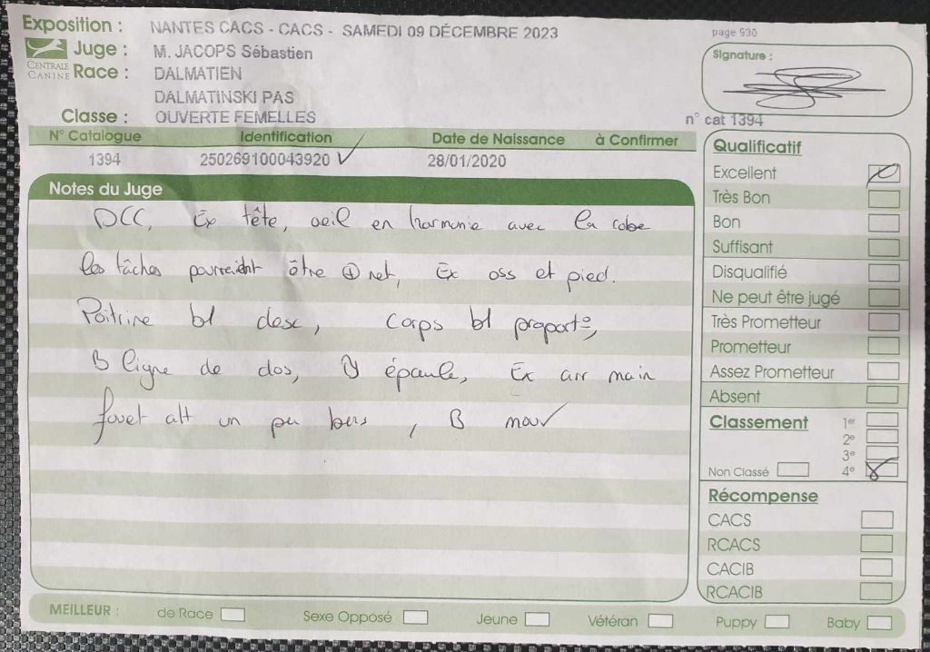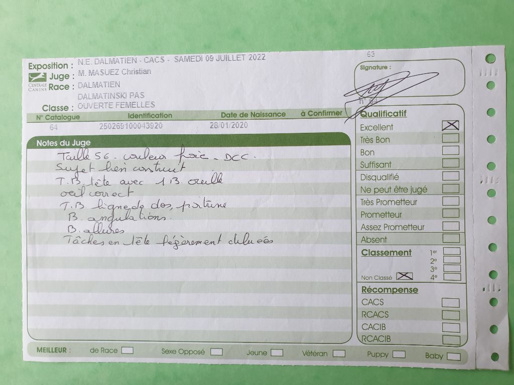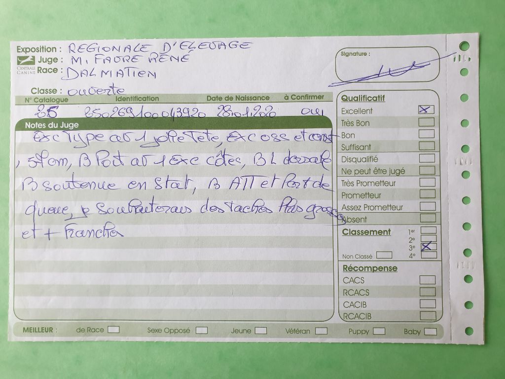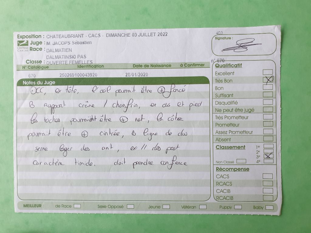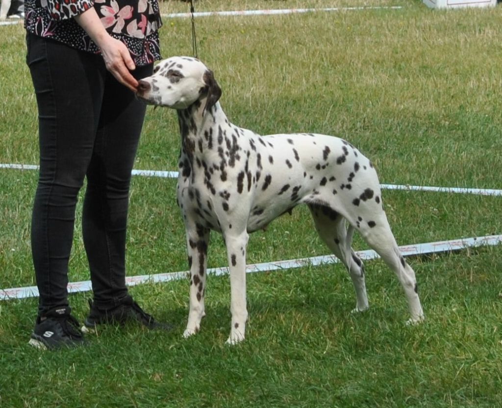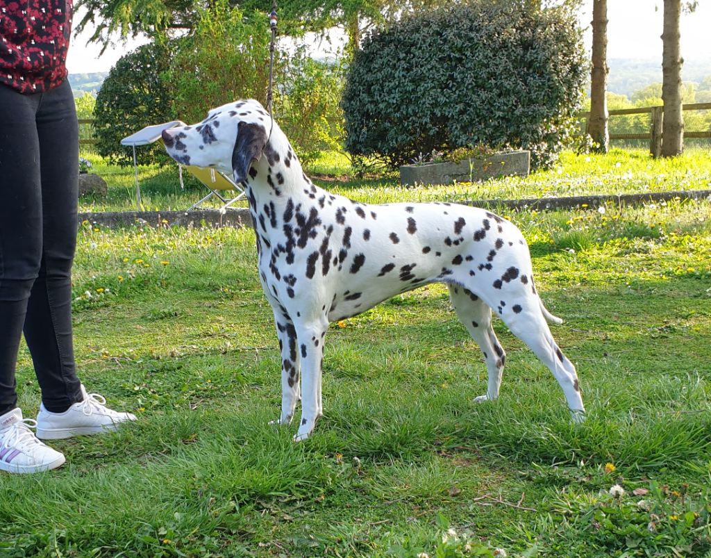 Dentition Complète en Ciseaux. Excellente tête. L'oeil pourrait être plus foncée. Bon rapport crâne / chanfrein, Excellents ossatures et pieds, les tâches pourraient être plus nettes, les côtes pourraient être plus cintrées. Bonne ligne de dos. Serre légèrement des antérieurs. Excellent parallélisme des postérieurs. Caractère timide, doit prendre confiance