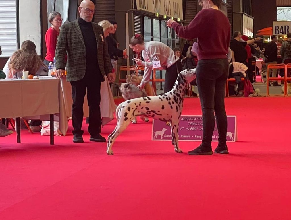Excellent type avec une jolie tête. Excellentes ossatures et constructions. Féminine. Bonne poitrine avec excellentes côtes, Bonne longueur dorsale. Bien soutenue en statique. Bonne attache et port de queue. Je souhaiterais des tâches plus grosses et plus franches.