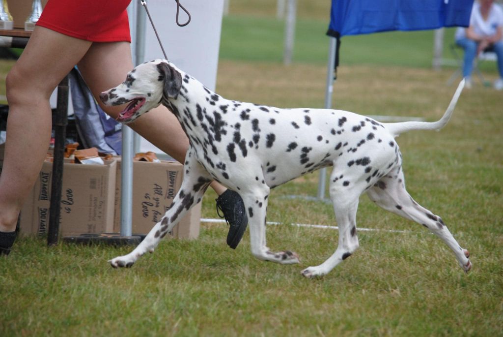 DCC. Excellente tête. Oeil en harmonie avec la robe. Les tâches pourraient être plus nettes. Excellentes ossature et pieds. Poitrine bien descendue. Corps bien proportionné. Bonne ligne de dos. Bonnes épaules. Excellente arrière main. Fouet attaché un peu bas. Bon mouvement.