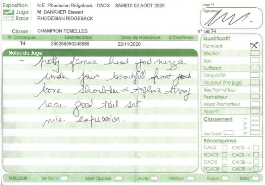 Chienne puissante, très jolie tête, bonne longueur chanfrein, excellents crâne/stop et oreilles, bonne couleur d'oeil, bonne épaule, poitrine descendue et profonde, excellentes angulations arrière, excellent ridge avec 2 couronnes dans la boite, excellent A/R, bon mouvement avec bonne ligne de dessus