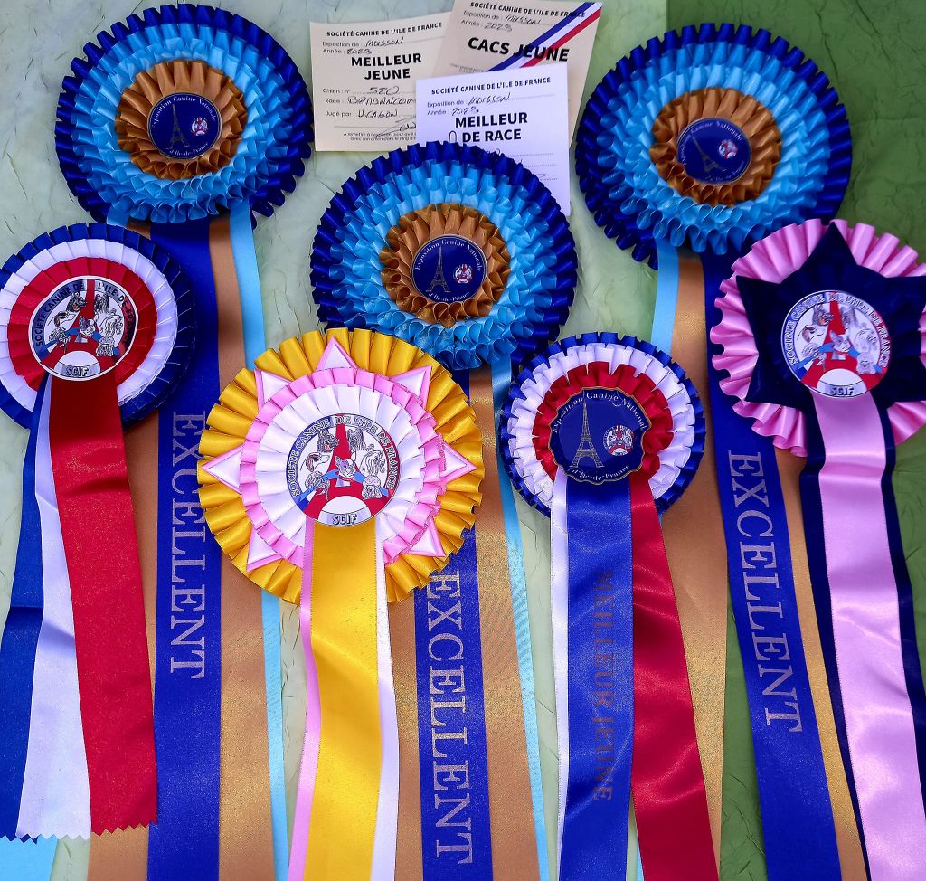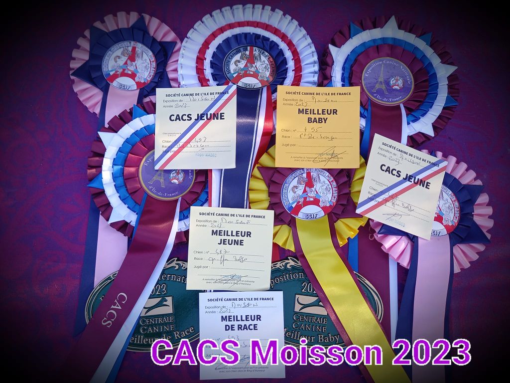 Excellent type et gabarit, corps bien carré, excellente ligne dessus, poitrine, épaules, aplombs avant, bonnes angulations arrières, bonne texture de poil, jolie tête avec bon volume, bonne largeur de mâchoire, démarche libre.
