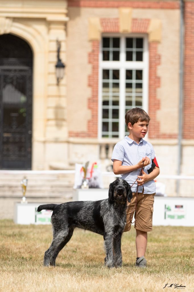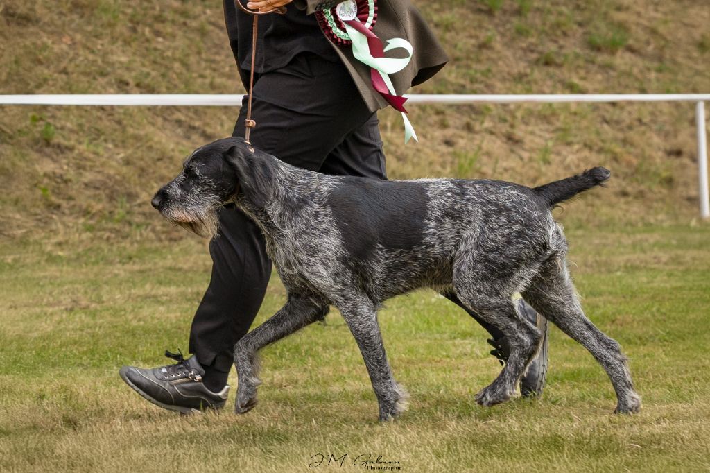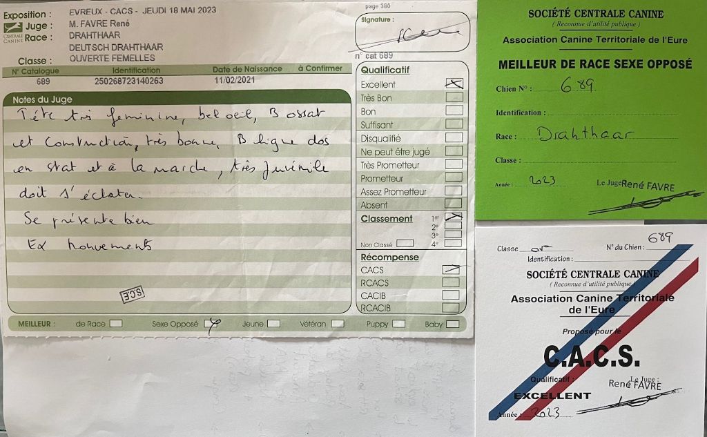 Excellent pigmentation, denture complète. Lignes du crâne correctes. Excellentes épaule, angulations. Excellente ossature, aplombs, poitrine dans ses trois dimensions. Excellente insertion du fouet.Excellents mouvements.