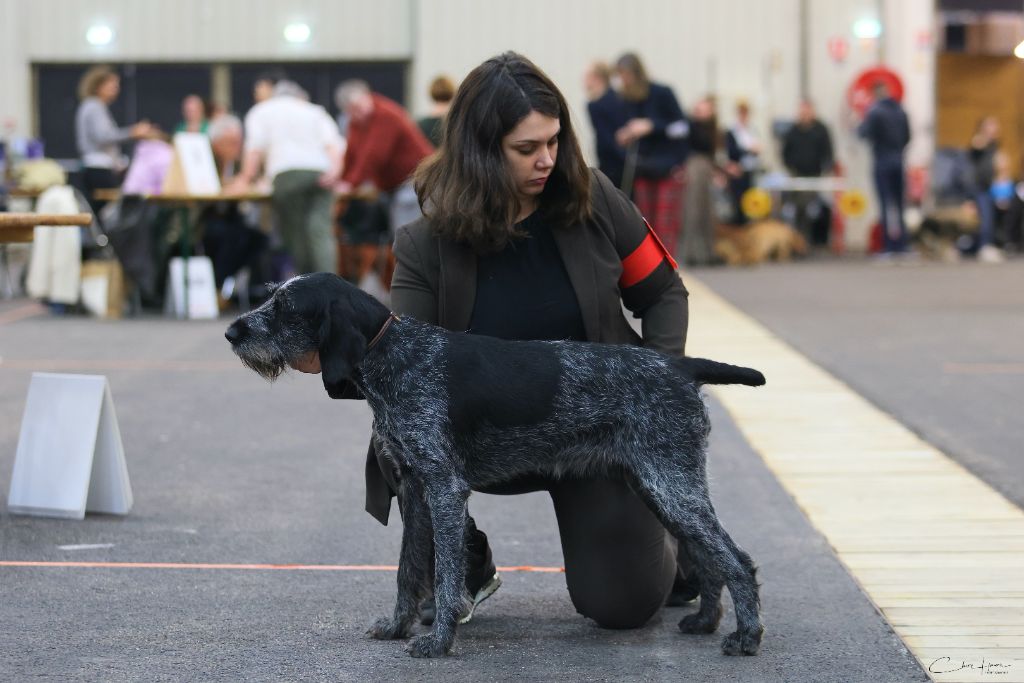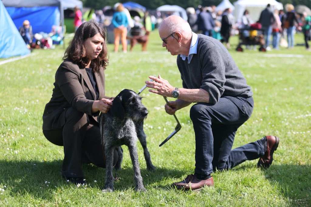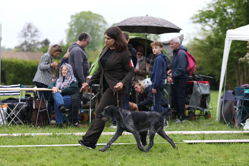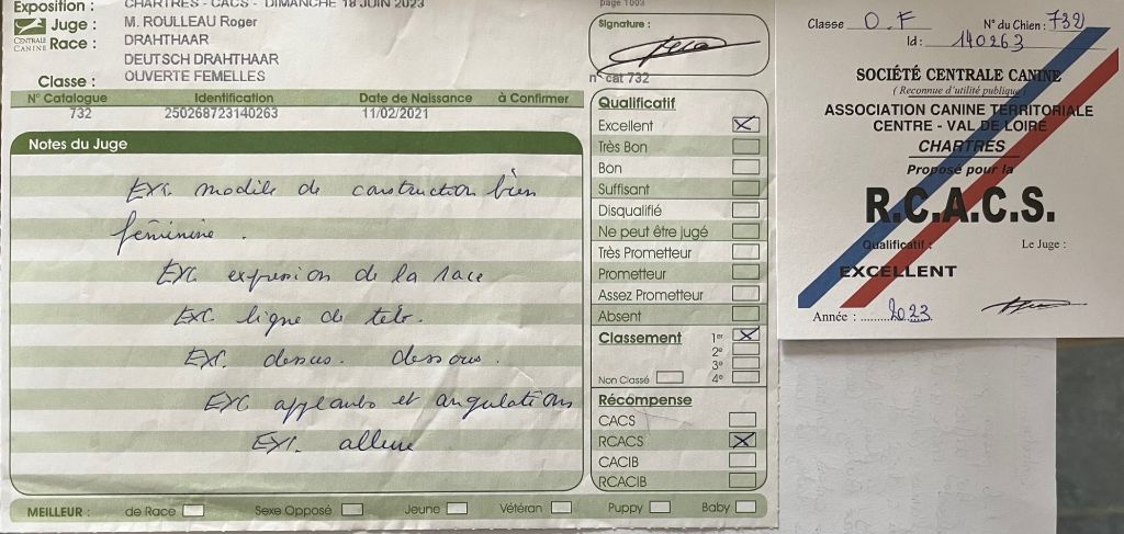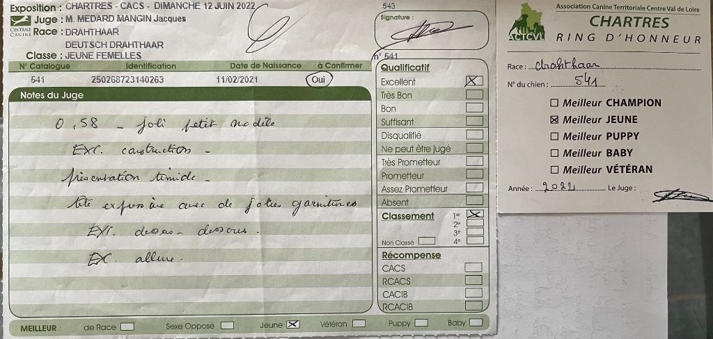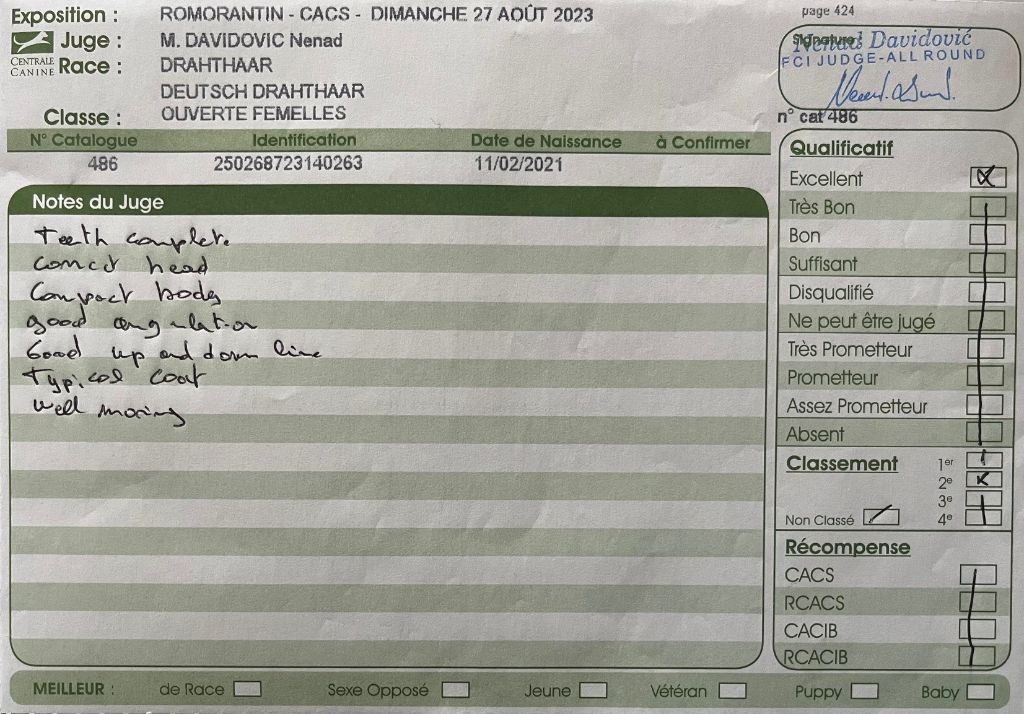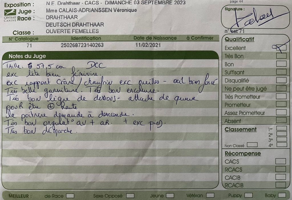 Sujet dans le type de sa race. Tête bien caractéristique. Oeil de bonne couleur. Oreille bien attachée. Excellente truffe et chanfrein. Jolie expression. Excellente encolure, ligne du dessus bien solide. Chienne robuste excellente ossature. Excellent caractère. Aplombs et angulations excellentes. Excellent mouvements réguliers et dynamiques. Excellent poil.