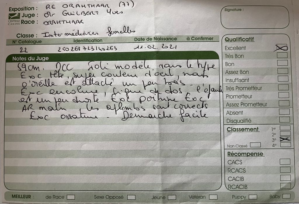taille 57.5 cm. Dentition complète en ciseau. Excellente tête bien féminine. Excellent rapport crâne/chanfrein, excellentes oreilles. ?il bien foncé. Très belle garniture. Très bonne encolure. Très bonne ligne du dessous. Attache de queue pourrait être plus haute. La poitrine demande à descendre. Très bonnes angulations avant/arrière, excellents pieds. Très bonne démarche.