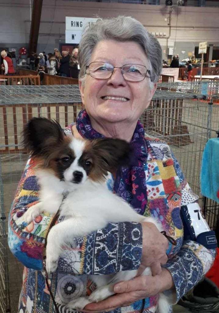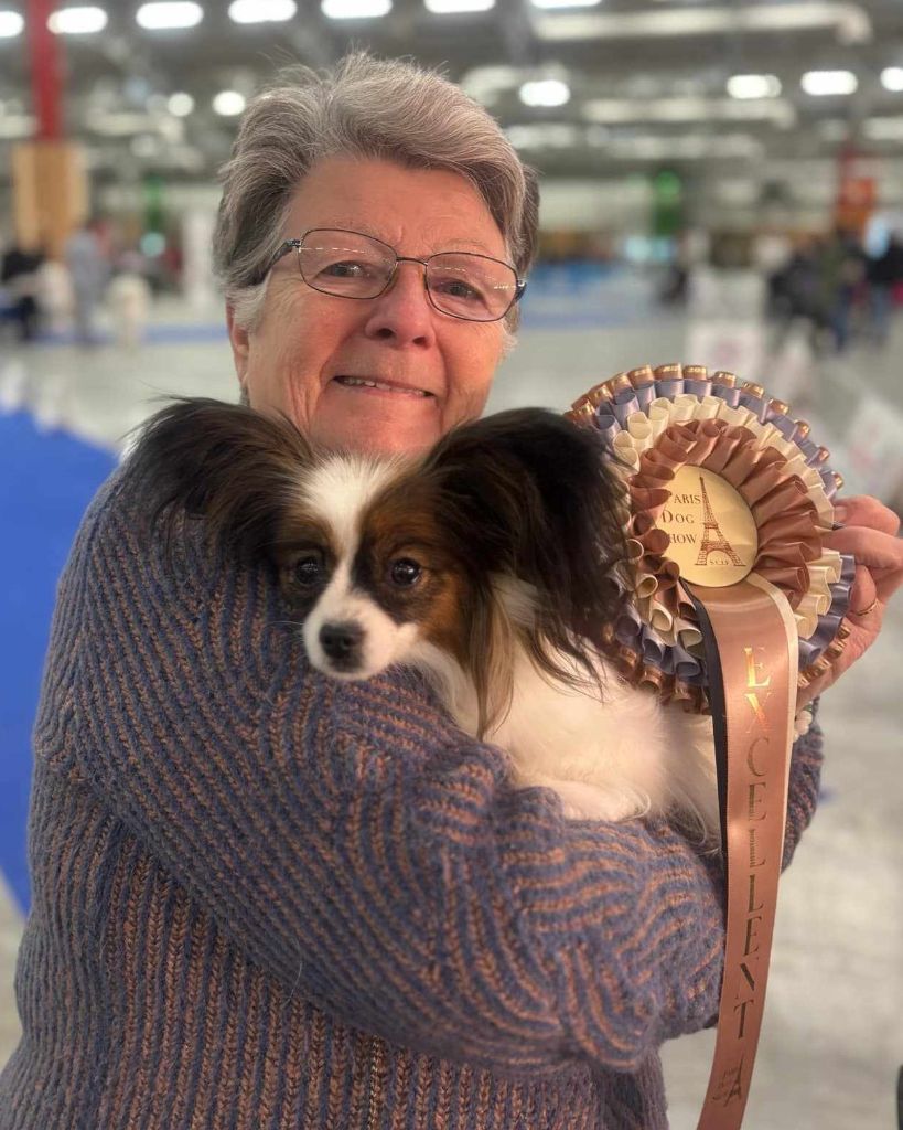 DCC, bicolore moyennement charbonnée, listée, excellent rapport crâne chanfrein, oreilles bien placées avec franges, antérieurs bien parallèles avec jolis pieds de lièvre avec plumes, excellente poitrine, excellente arrière main, dos bien droit, excellent qualité de poils, jabot culotte panache, présentation un peu timide