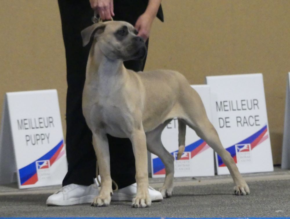 Bonnes proportions générales, les lignes en tête doivent se faire, très bonne denture, excellente ossature, excellents aplombs, excellents pieds, excellente épaule, croupe un peu ronde, très bonne arrière-main. Bébé un peu crispé aujourd'hui, doit apprendre à se détendre en ring. Serre jarrets à la marche. Prend bien le terrain de profil.