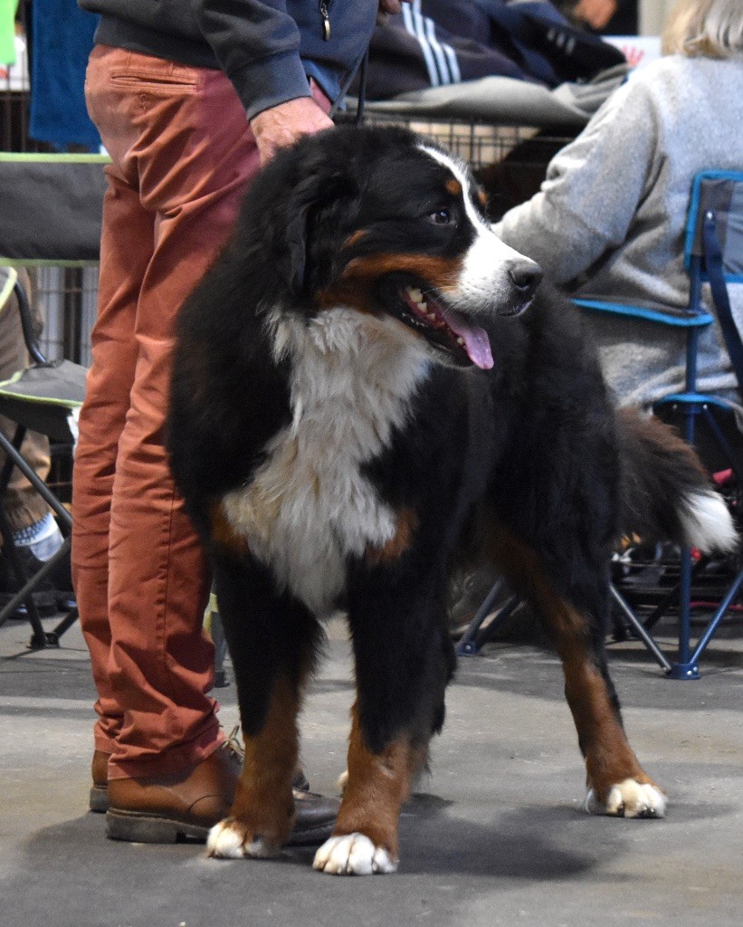 15 mois Bon format Excellente ossature Très bons aplombs avantExcellente angulation arrière Epaule en place Très bonne ligne de dessus La poitrine doit se mettre en place Le fouet est long DCCLa tête doit encore s'éclater Excellent oeil Bon rapport crâne chanfrein Très bon déplacement dynamiqueChien présenté en mue complète