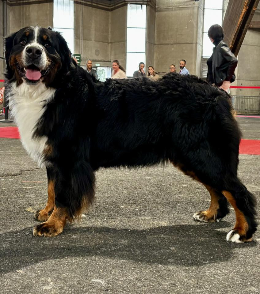 2ieme Exc en classe Intermédiaire20mois Aurait souhaité marquage blanc aux pattes plus uniforme. Forte ossatureBonne largeur de poitrine Épaule souhaite plus fermée Angulation AR souhaite plus marqué au GrassetSclérotique non pigmenté des 2 côtés Crâne bien en placePoitrine bien descendu Fouet bien implanté et de bonne longueurBon aller/retour Jolie mouvement DCC