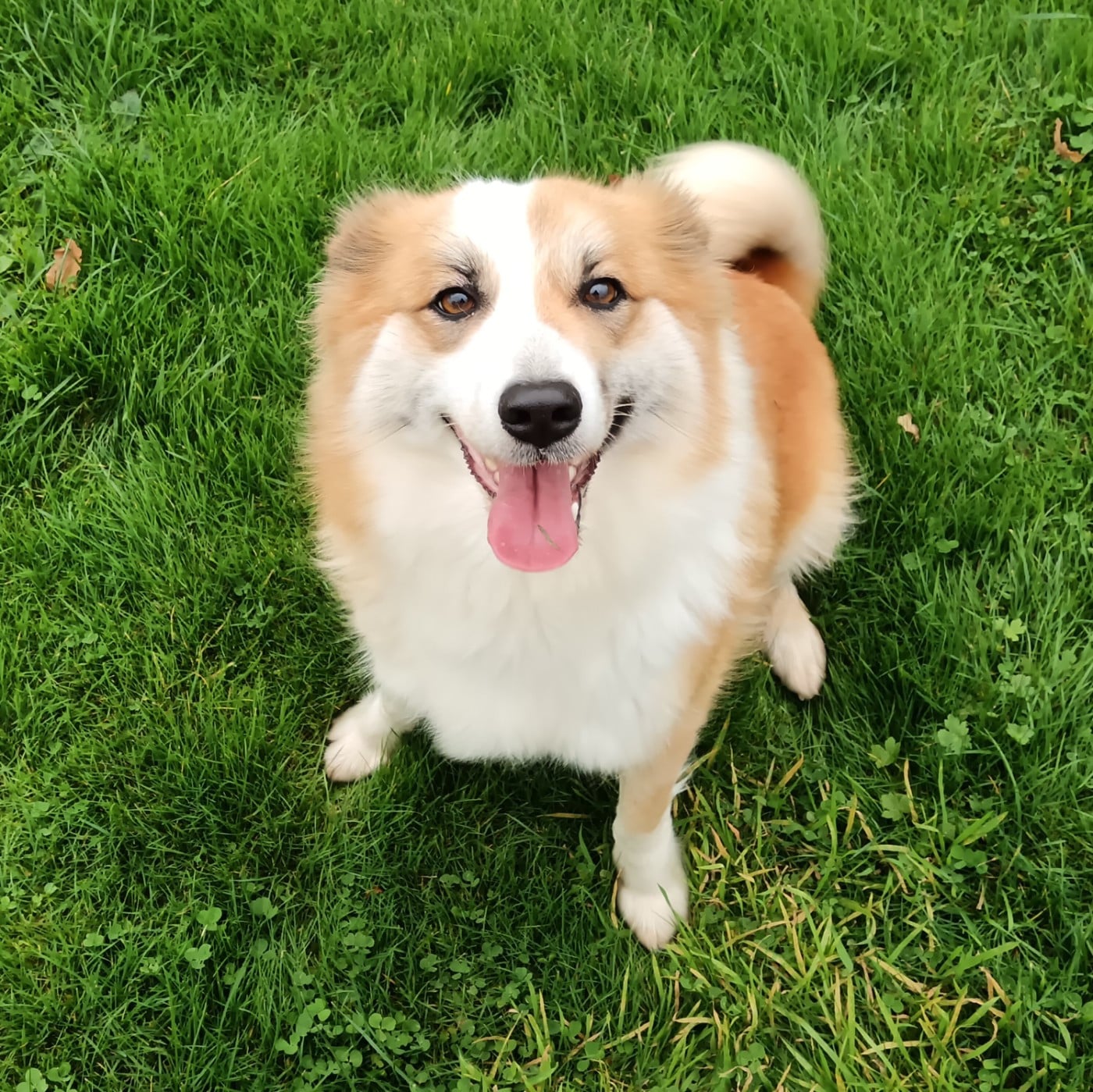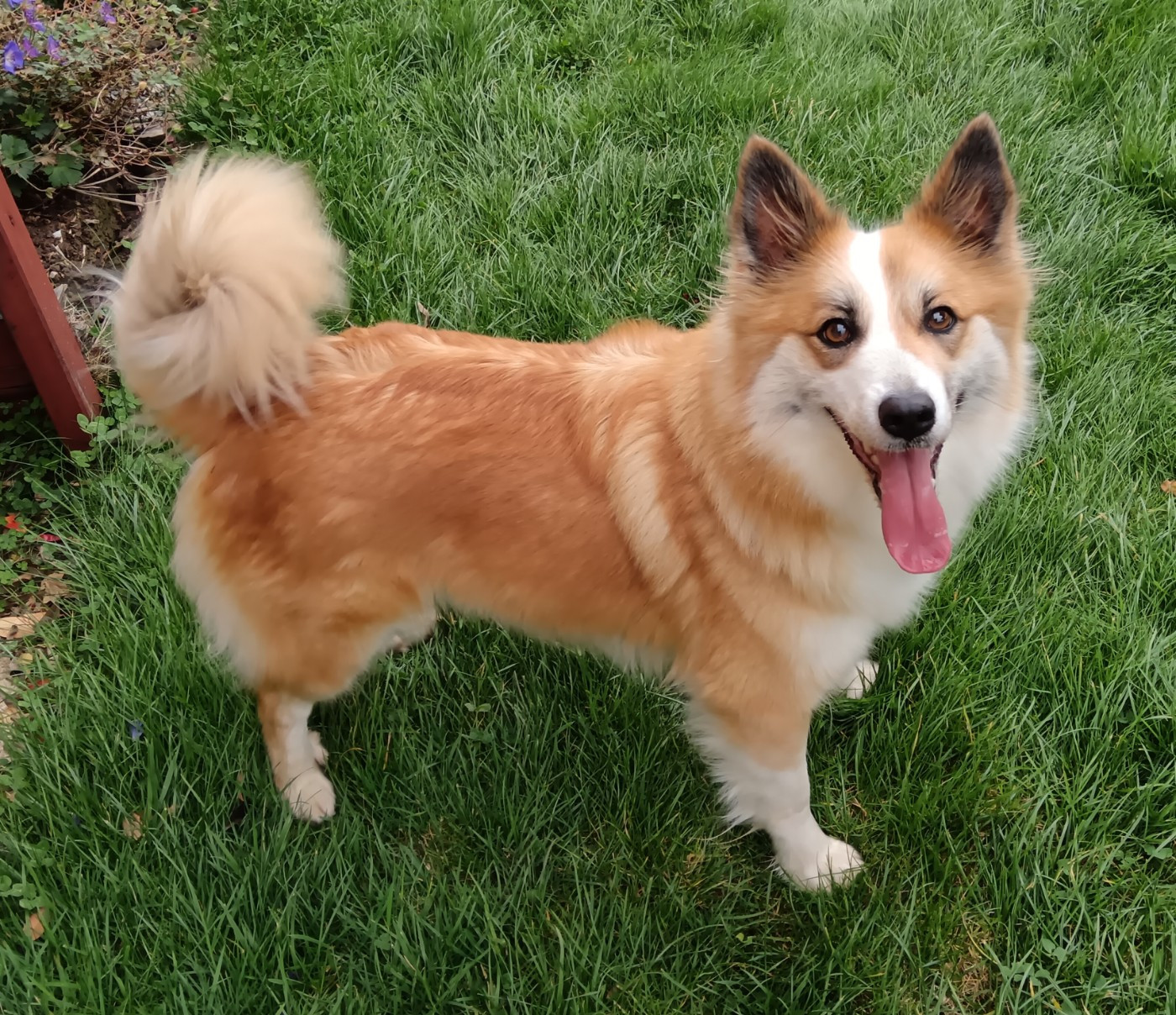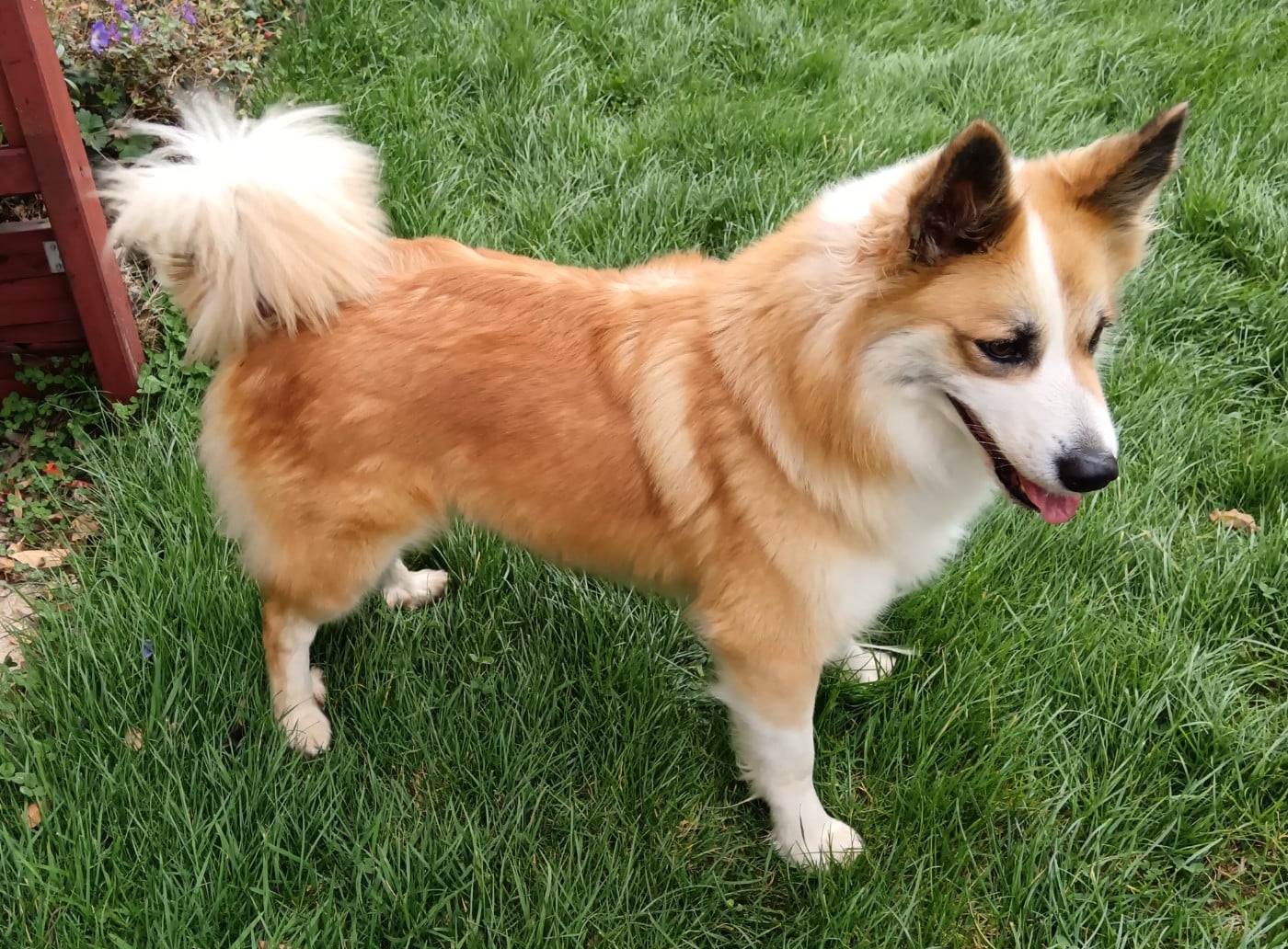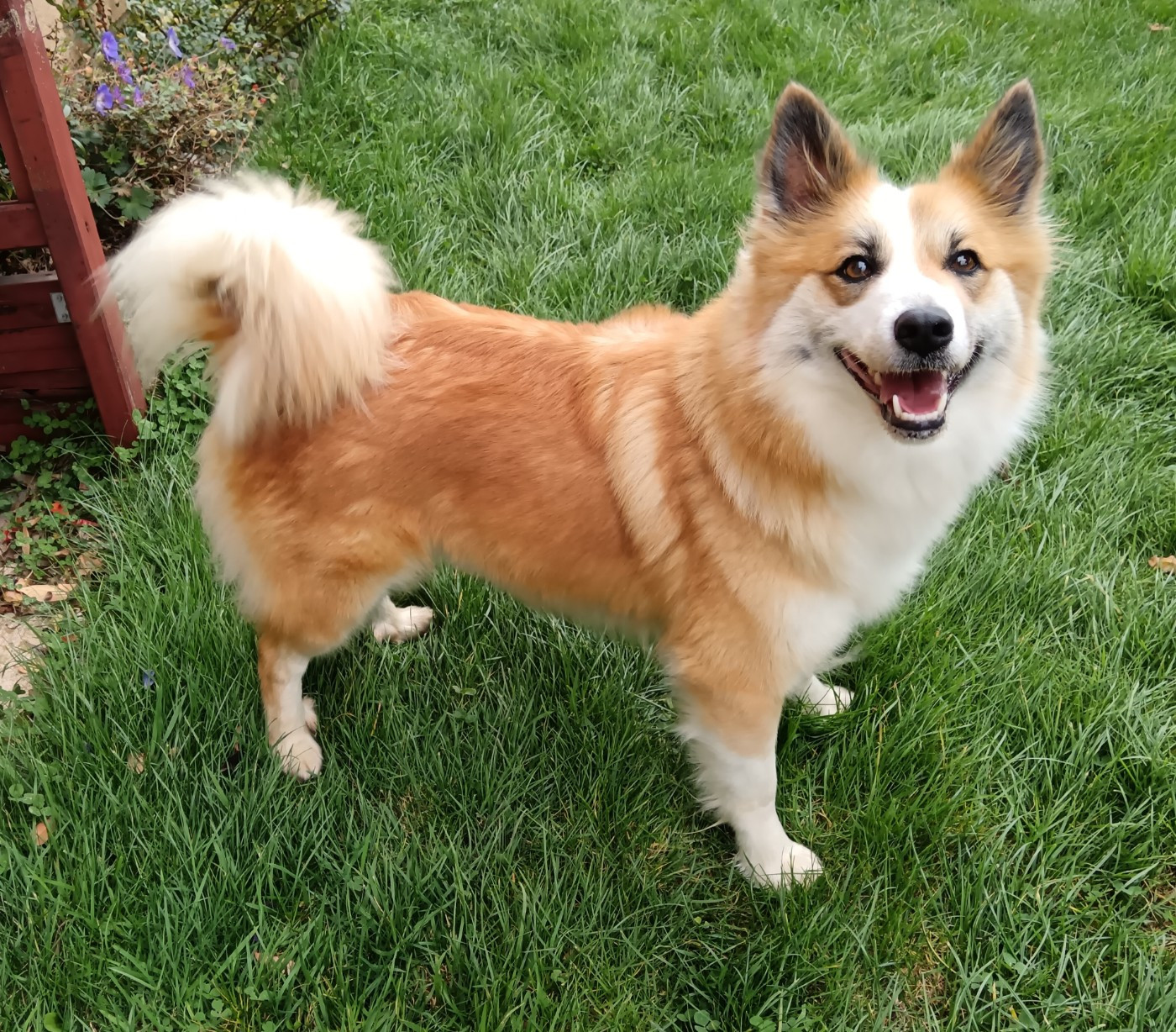 Jeune chienne berger islandais à poil long fauve roux charbonné à panachure blanche, 13 kg, agréable, câline, joueuse.