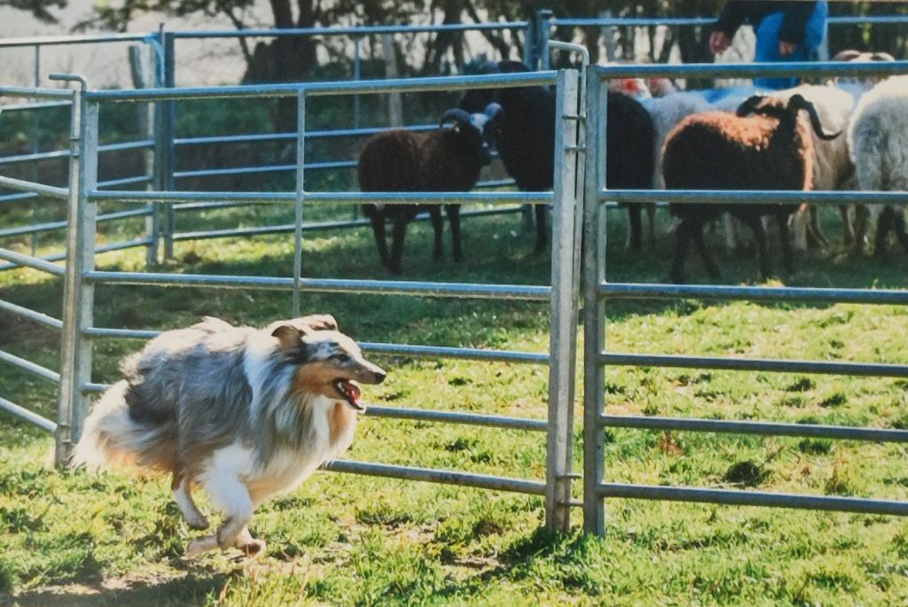 Il a obtenu son NHAT (le Natural Herding Aptitude Test contient un test de socialisation + un test d'aptitudes naturelles au travail sur troupeau) mention excellent à 11 mois, depuis il continue les entraînements sur troupeaux ovins.