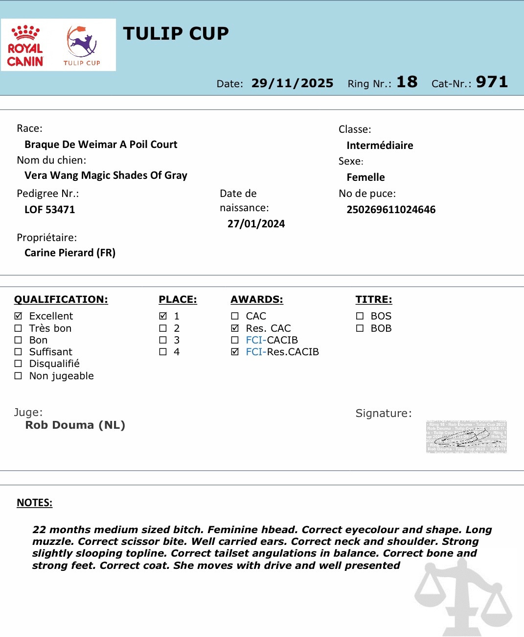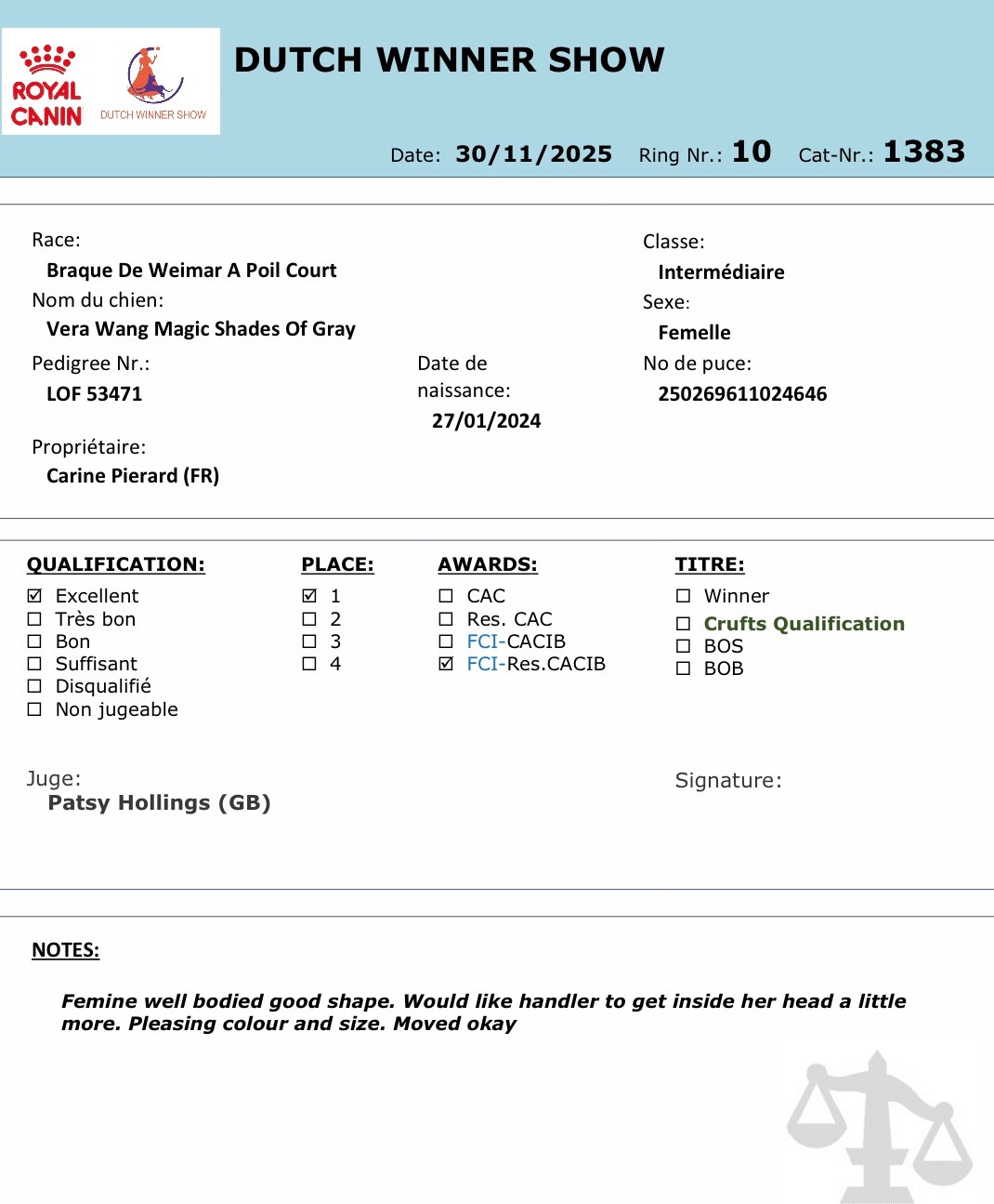 Première Régionale d Élevage du Braque de Weimar dans notre région (Grand Est)Multi JCh -CIE.J Vera Wang Magic Shades Of Gray dite Vic.Sous le jugement de Mme Nathalie Parent, Vic a remporté la classe intermédiaire femelles puis a poursuivi sur sa lancée en obtenant le Meilleur de Sexe Opposé. Une immense fierté pour sa première Régionale d Élevage.Nous sommes très fiers de ce beau résultat, heureux de voir la descendance de Preston & Nala mise en valeur, et surtout ravie d avoir partagé cette journée dans une ambiance chaleureuse, avec le plaisir de revoir des personnes que nous n avions pas croisées depuis longtemps et d en rencontrer de nouvelles. Merci à Stéphanie d avoir relevé le défi d organiser cette grande première avec l aide de la CUCC. Un grand bravo à toi, tu as géré ça avec brio. Le cadre est magnifique, il est déjà posé fièrement sur mon étagère.Père : EW 25 Preston Wittelsbach Del Monte Alban V-EW 22 -FR 22 - CIE - Multi BIG - BISS-BIS-III-Multi Ch.-Multi GCh.-Multi Top Dog-CAC WDS 2023Mère : Multi Ch.-CIE -CIB-Cotation 2 Oyma du Chêne Sessile.