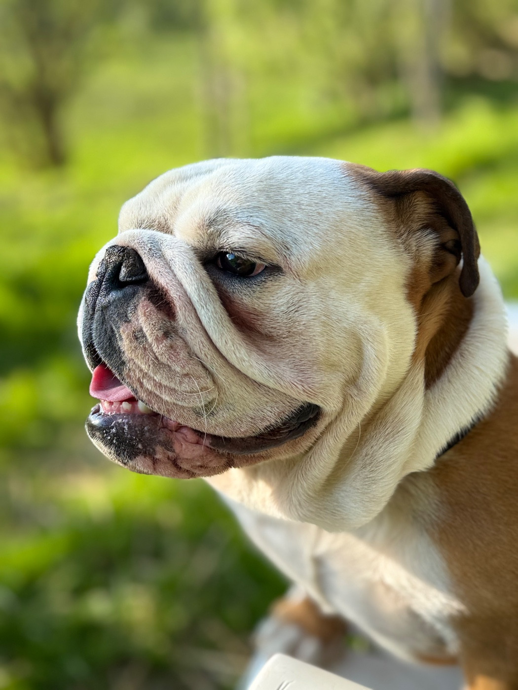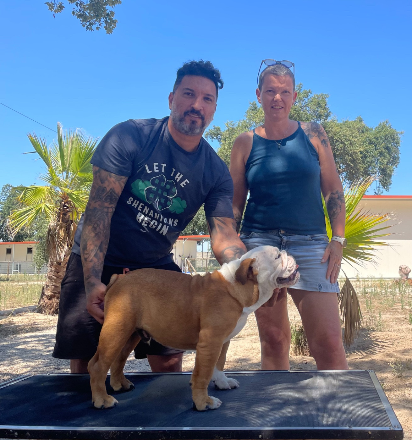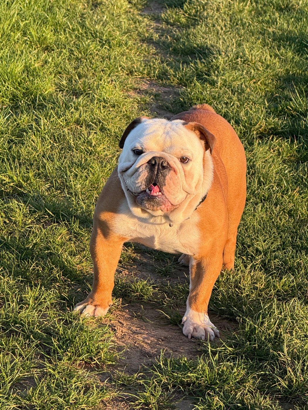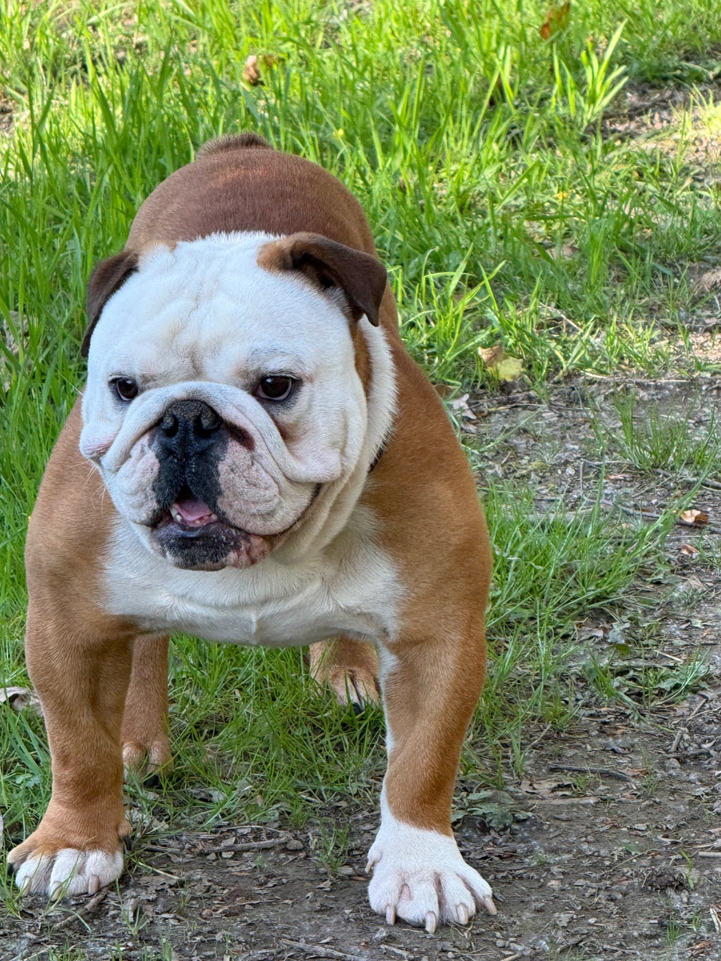 Rouge/ fauve à panachures blanchesSujet bien proportionnéTête avec une bonne expression typiqueBonnes rides finesNarines un peu pincéesBon couBonne pigmentationBonne largeur de la mâchoire inférieureBons yeux bien foncés et sainsYeux bien placésBonnes oreilles en rose bien placées Bonne ligne de dessusLa poitrine pourrait être plus descendueLa poitrine doit encore se developper Bons aplombs avantPieds un peu écrasésBon arrière mainQueue bien placée Queue en tire bouchonAllures correctesAllures juvénilesChien sympathique