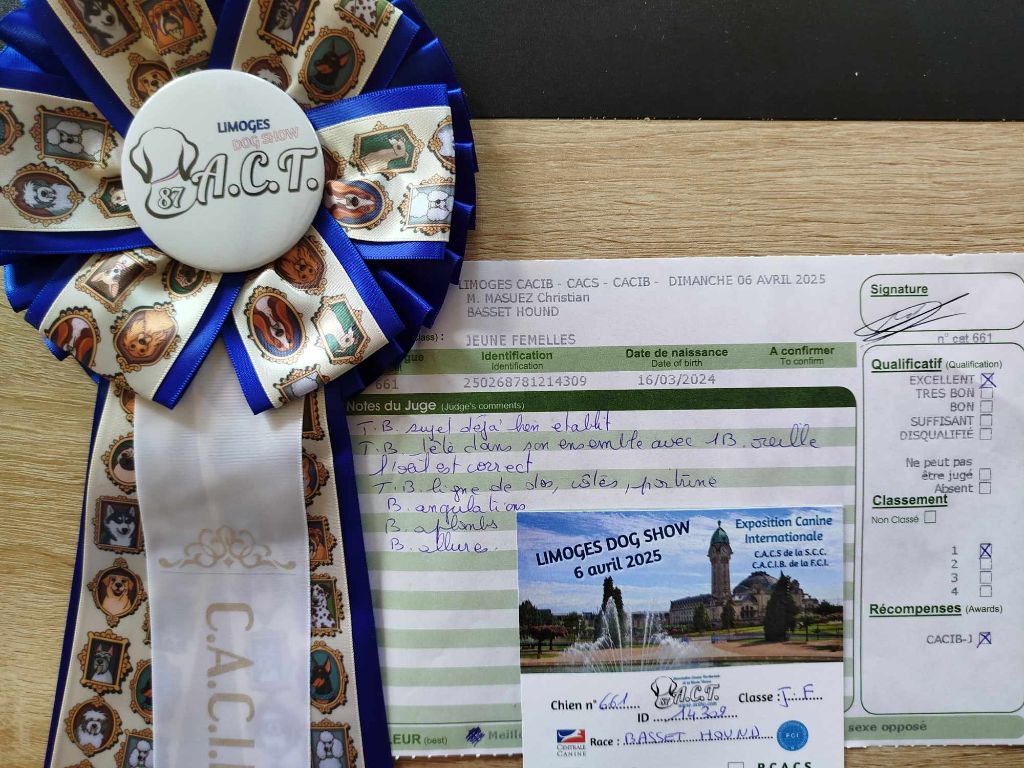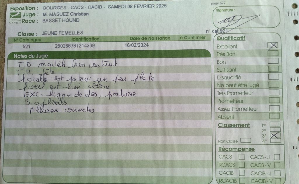 Très bon sujet déjà bien établit. Très bonne tête dans son ensemble avec une bonne oreille. L'?il est correct. Très bonne ligne de dos, côtes, poitrine. Bonnes angulations. Bons aplombs. Bonnes allures.