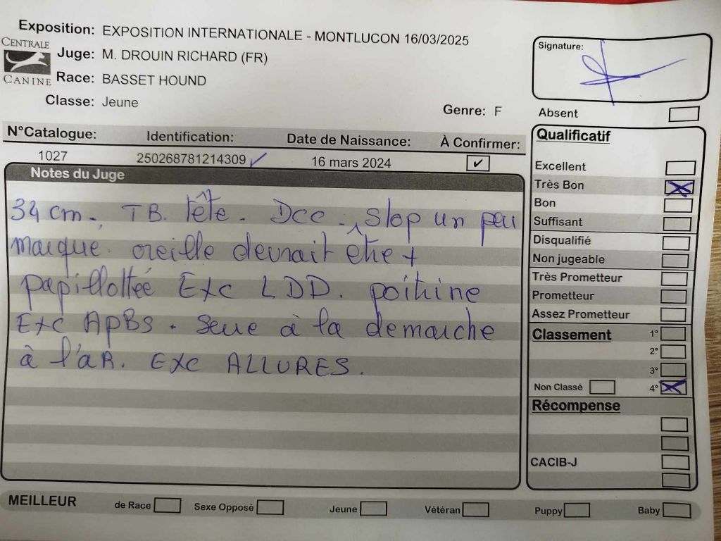 Construction correcte. Jolie tête, stop un peu trop marqué. Babines importantes. Excellente denture et pigmentation. Oreilles de bonne longueur et bien portée. Excellente sortie d'encolure, dessus et poitrine. Fouet bien porté, construction un peu longuette. Serre un peu des postérieurs à la démarche.