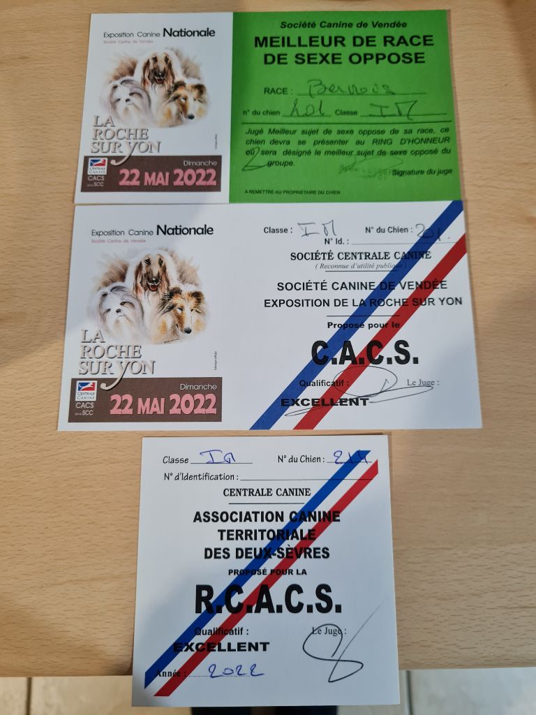 ( Qualificatif excellent à chaque fois en 2022 + le R.C.A.C.S. EN intermédiaire mâles le 30 Octobre 2022. Meilleur de race de sexe oppose le 22 Mai 2022 avec un Excellent et il a obtenu son CACS le même jours .