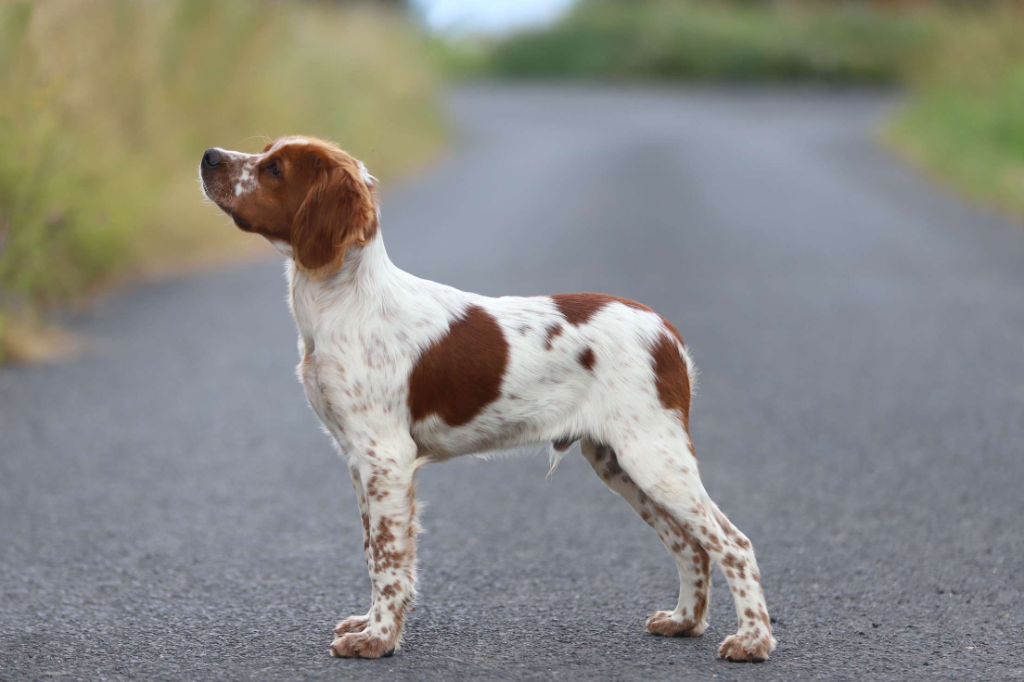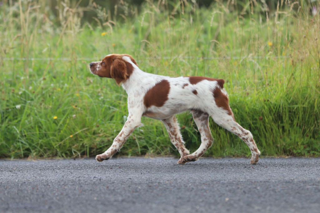 47cm. Denture en formation , Très jolie sujet bien typique de sa race. Très jolie tête bien bretonne, excellent oeil de bonne couleur. oreille bien attachées. excellent poil et pigmentation. ensemble bien angulé