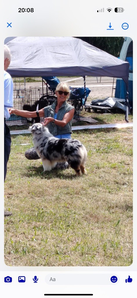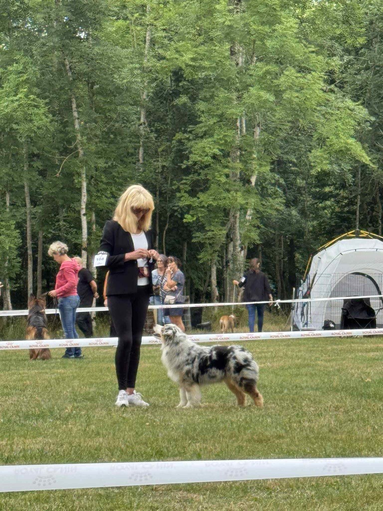 Bleue merle, superbe petit modèle. DCC. Bien dans le type, bien féminine.Tête : très jolie tête, exc crâne, chanfrein. Pigmentation truffe ok. Lèvres sèches. Superbe expression, oeil bien placé, exc encolure. Exc dos, ferme, bras bien placé, exc poitrail, joli grasset.Mouvement typique. Chienne à revoir à l'âge adulte. Avenir très prometteur.Exc condition.