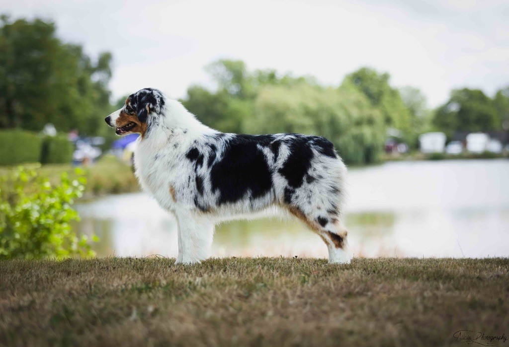 Bleue merle, jolie femelle, la tête est féminine Dentition latérale okCrâne plat, stop modéré, Excellente longueur de chanfrein, Excellente expression, oreille bien placéesExcellente dimension de corps mais un peu forte, le dos est droit avec d?excellentes proportions Excellent caractère avec un joli marquage bleu , chienne à revoir à l?âge adulte Excellent allure typique bergère