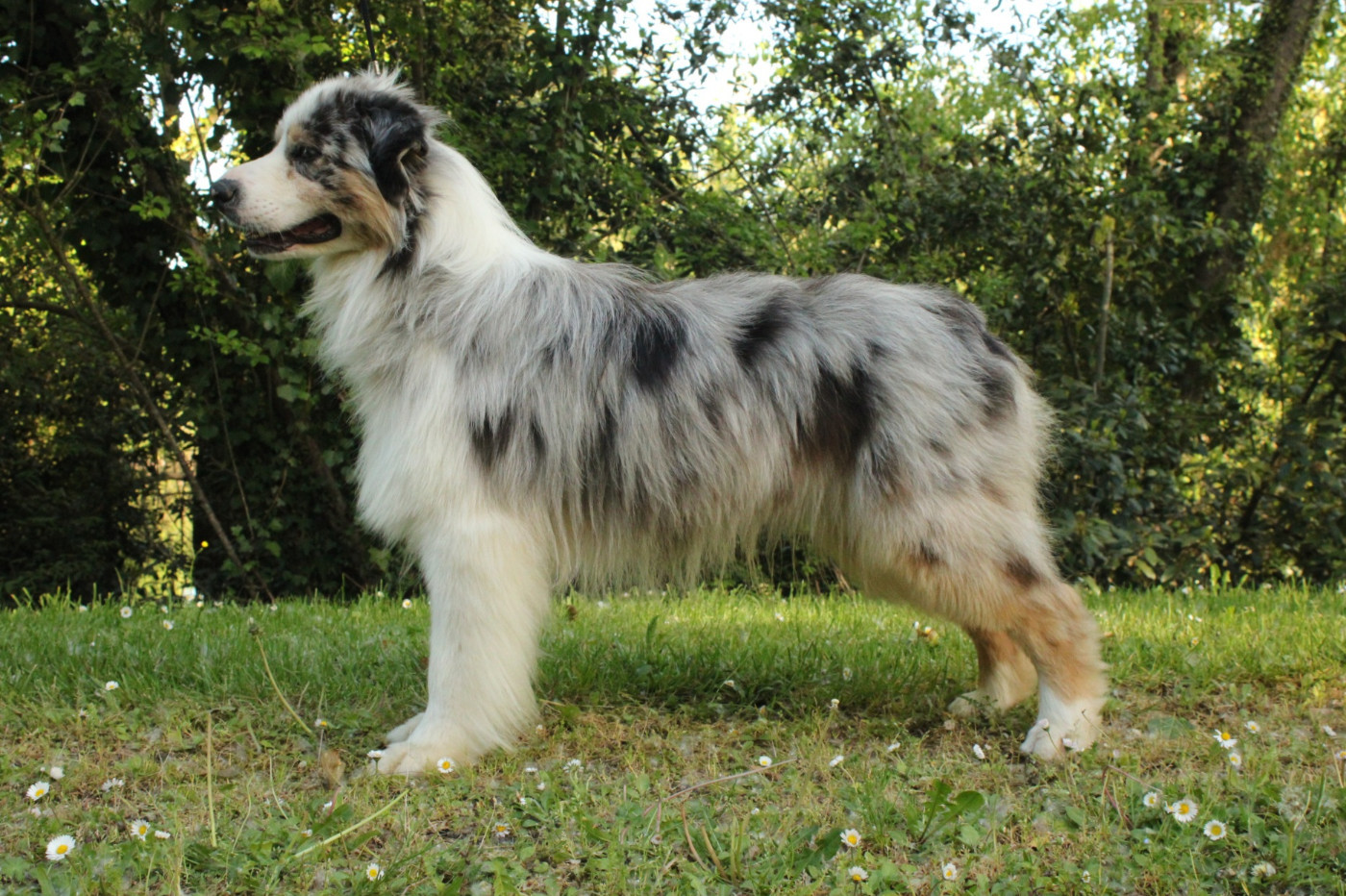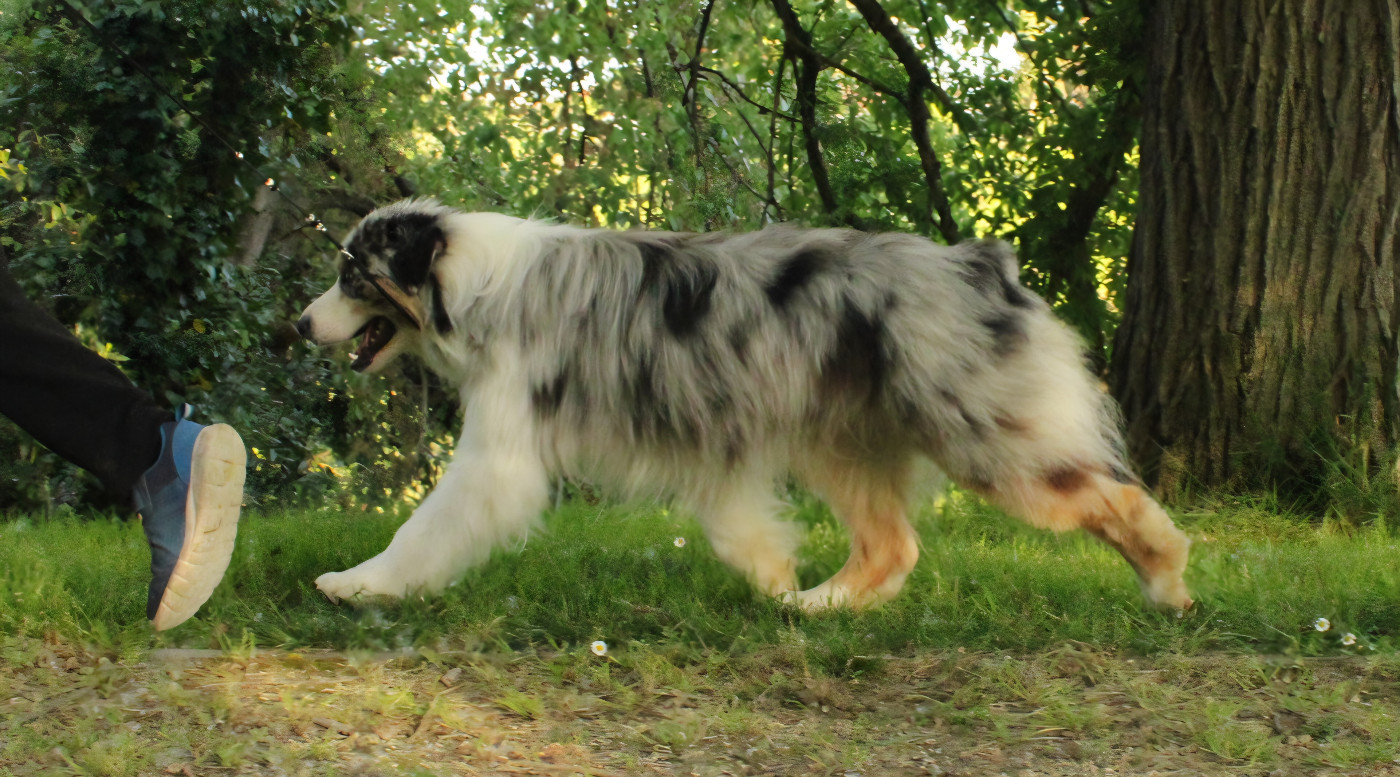 DCC bleu merle Bien proportionné Excellente poitrine et poitrailOssature moyenne Angulations correctesEncolures dégagée Un peu cambréeTête bien proportionnéeExcellent Crâne, Stop et museauOeil en amandeBelles oreilles attachées basLégèrement panard à l?arrière Serre un peu à l?arrière Ouvre les coudes à l?avantManque un peu d?amplitude