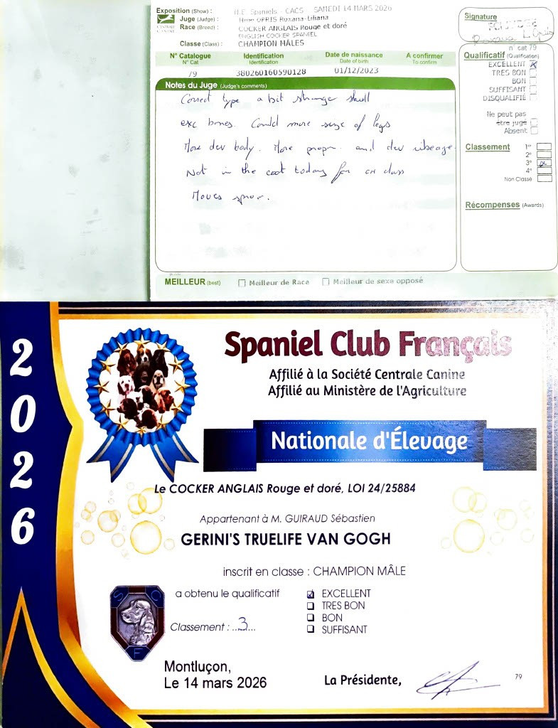 Gerini's Truelife Van Gogh, mâle Cocker Anglais Spaniel de robe rouge, il est inscrit au LOF, confirmé, radiographié dysplasie A, dépisté porteur sain APR et sain NF. Il est originaire d'Italie.