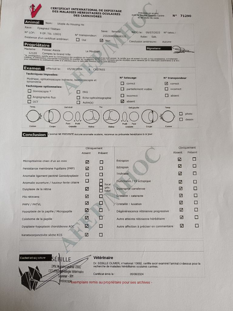 visite ophtalmologue : cataracte, luxation du cristallin, atrophie retinienne progressive - IndemneAtrophie retinienne progressive PRA.3 - Indemne 1.1