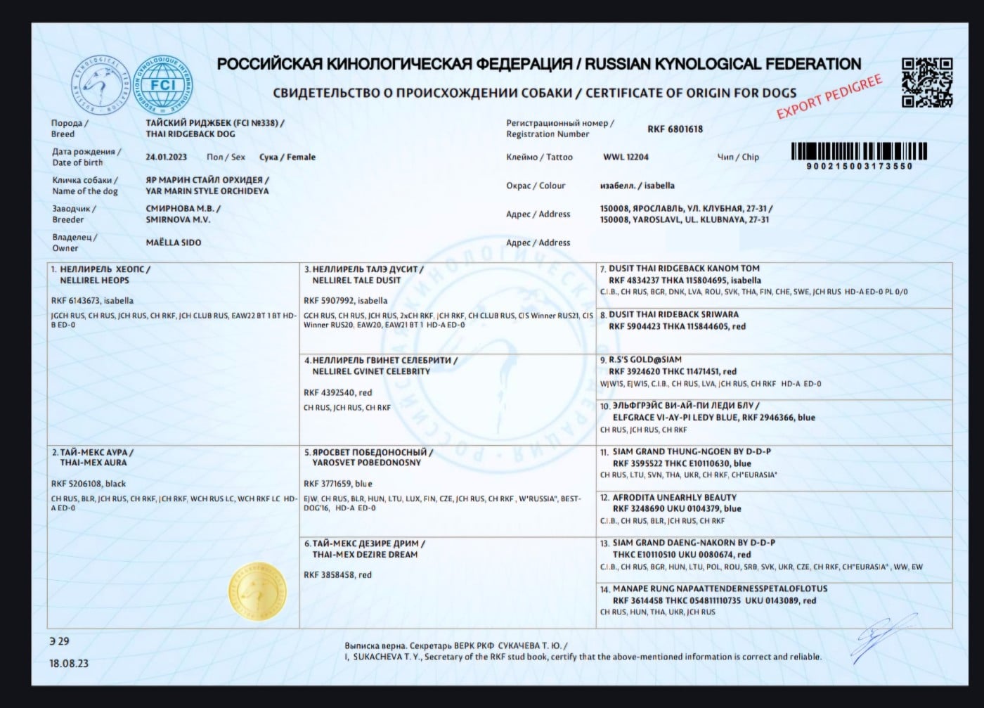 Pédigree de CH. yar marin style Orchideya