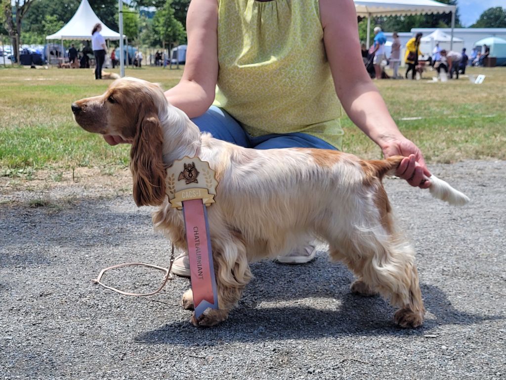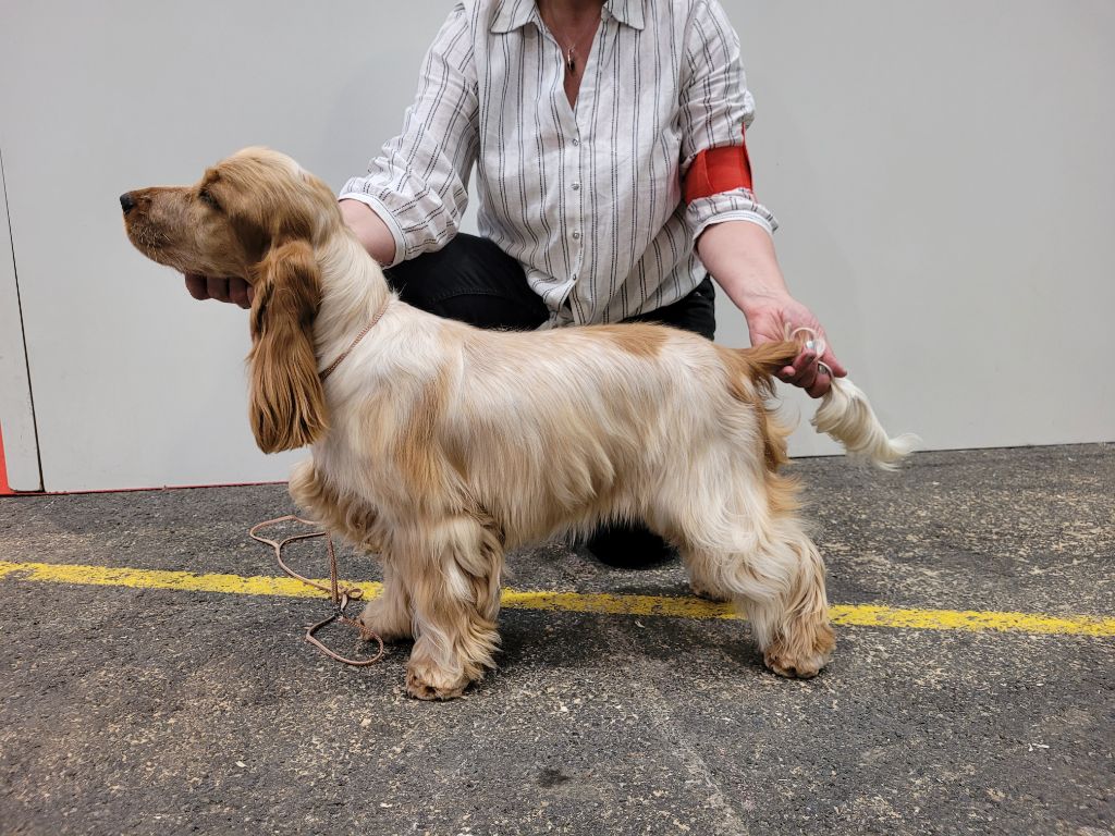 Blanche et orangeStop bien marquéJ'aimerai plus d'ossatureArrière main coudée un peu haut.Corps de lice. Bonne qualité de fourrureMarche un peu désordonnée