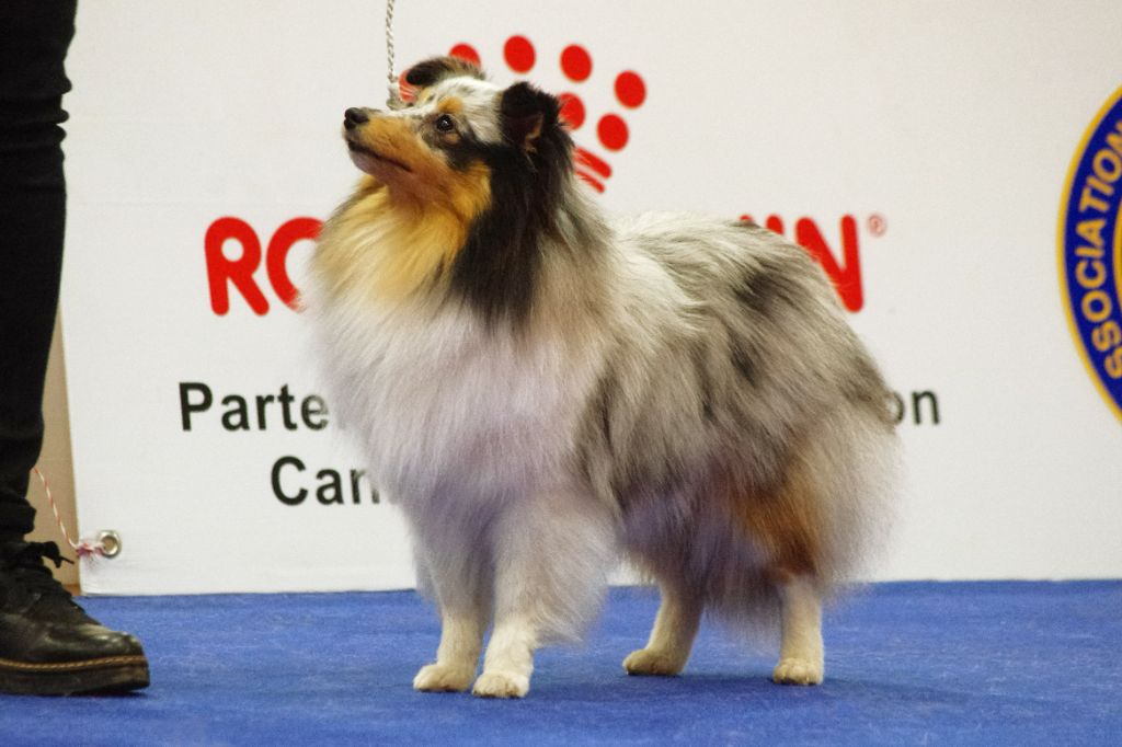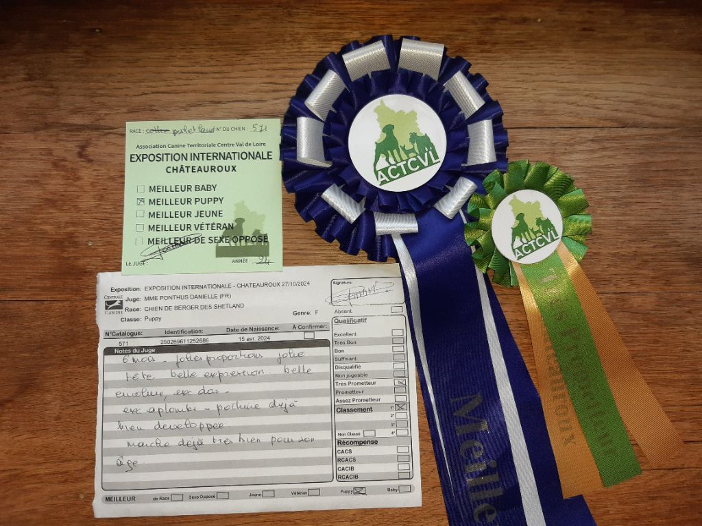 34.5 cm, DCCexcellent type et format, excellente tête, excellentparallélisme crâne chanfrein. L'oeil pourrait être un peu plus en amande. Excellente sortie d'encolure, excellente ligne de dessus, excellente couleur de bleu. Ossature correcte. La poitrine doit s'éclater.Oreilles un peu lourdes. Excellente texture de poil.Croise à l'avant. Excellentes allures de profil