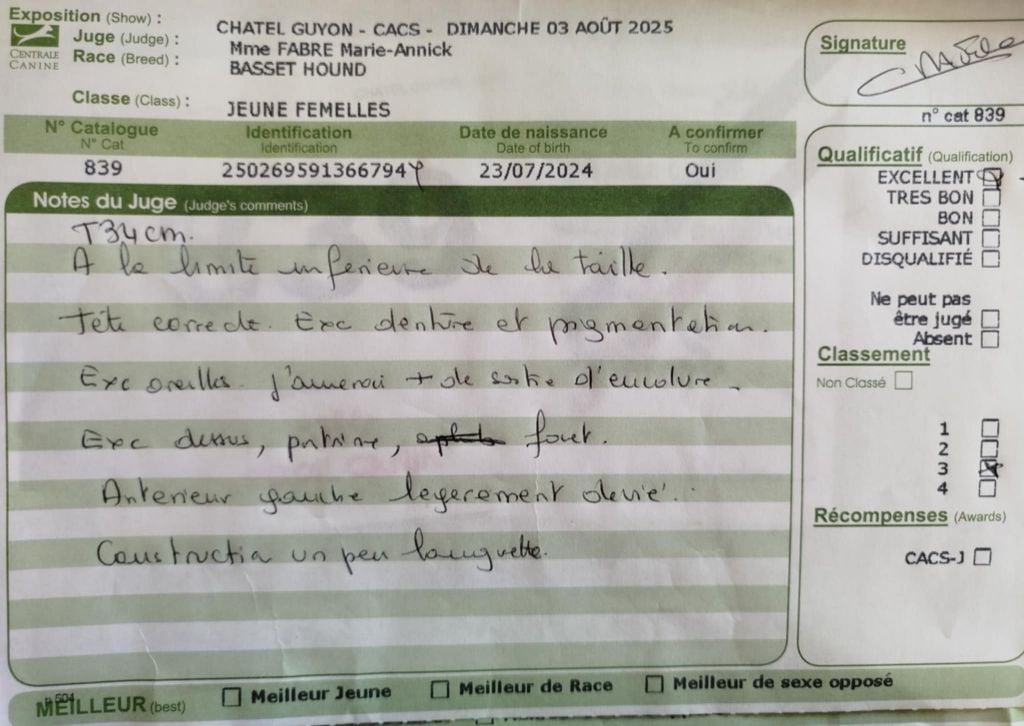 Taille 34 cmn à la limite inferieur de la taille. Tête correcte. Excellente denture et pigmentation. Excellente oreille, j'aimerai plus de sortie d'encolure. Excellent dessus, poitrine, fouet. Antérieur gauche légèrement dévié. Construction un peu longuette.