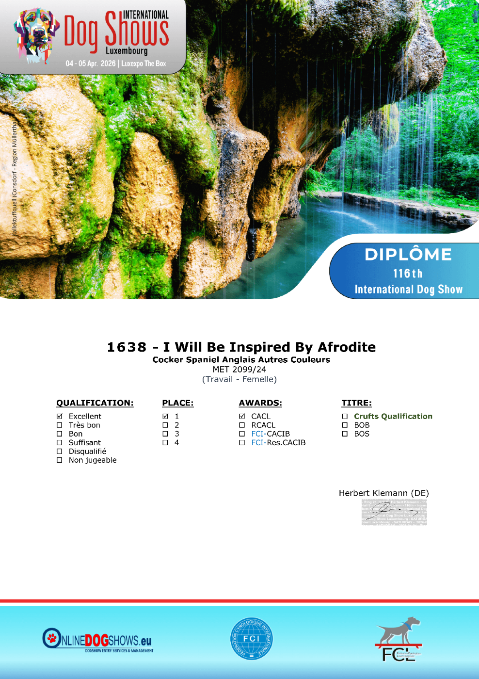 - 1er Excellent (Classe Travail), CACL, CACIB & BOS