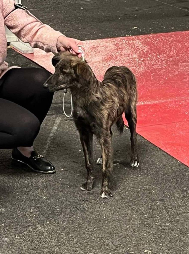 Sujet un peu réservé conforme à la race - tête harmonieuse dans ses proportions - stop apparent sans excès - ossature féminine - épaule bien placée - le mouvement est bien régulier - excellente prise de terrain et poussée conséquente