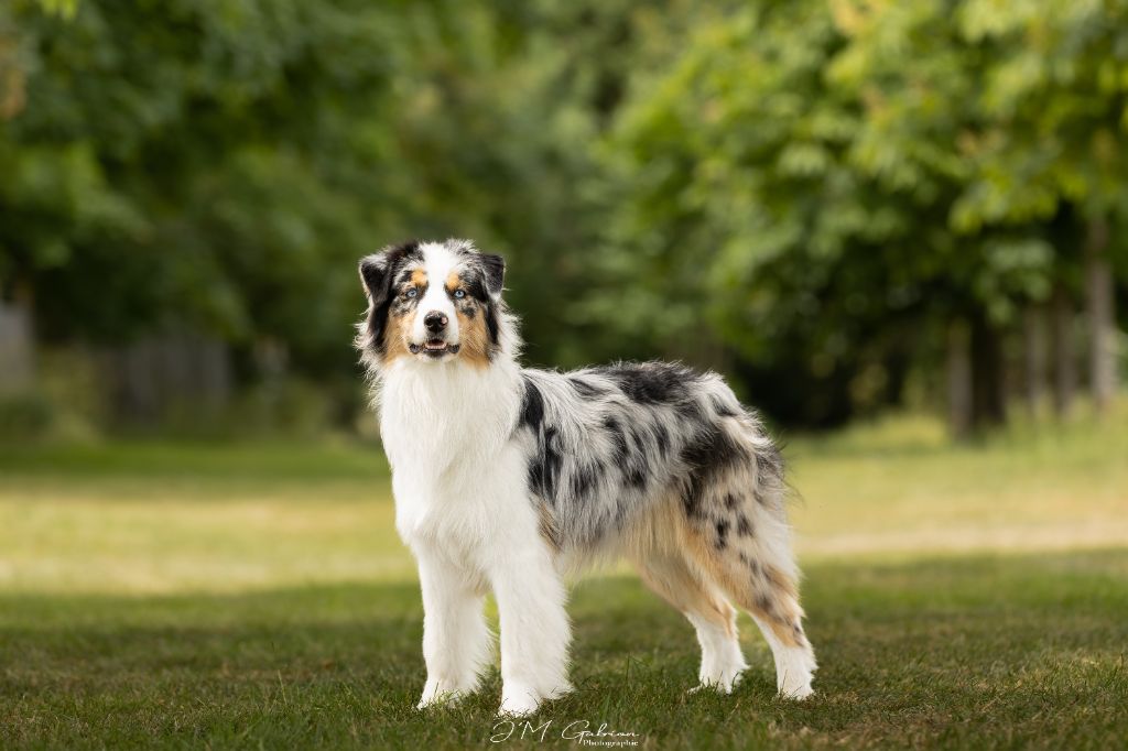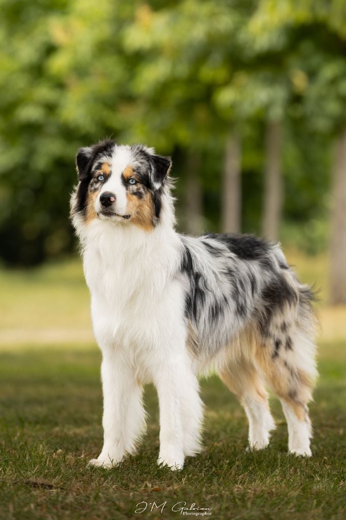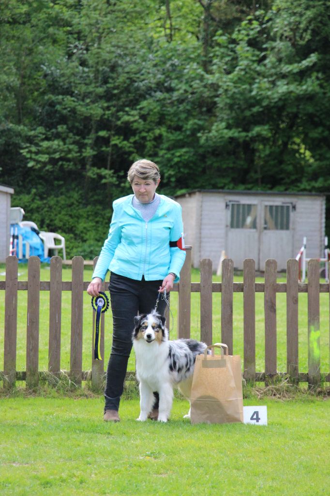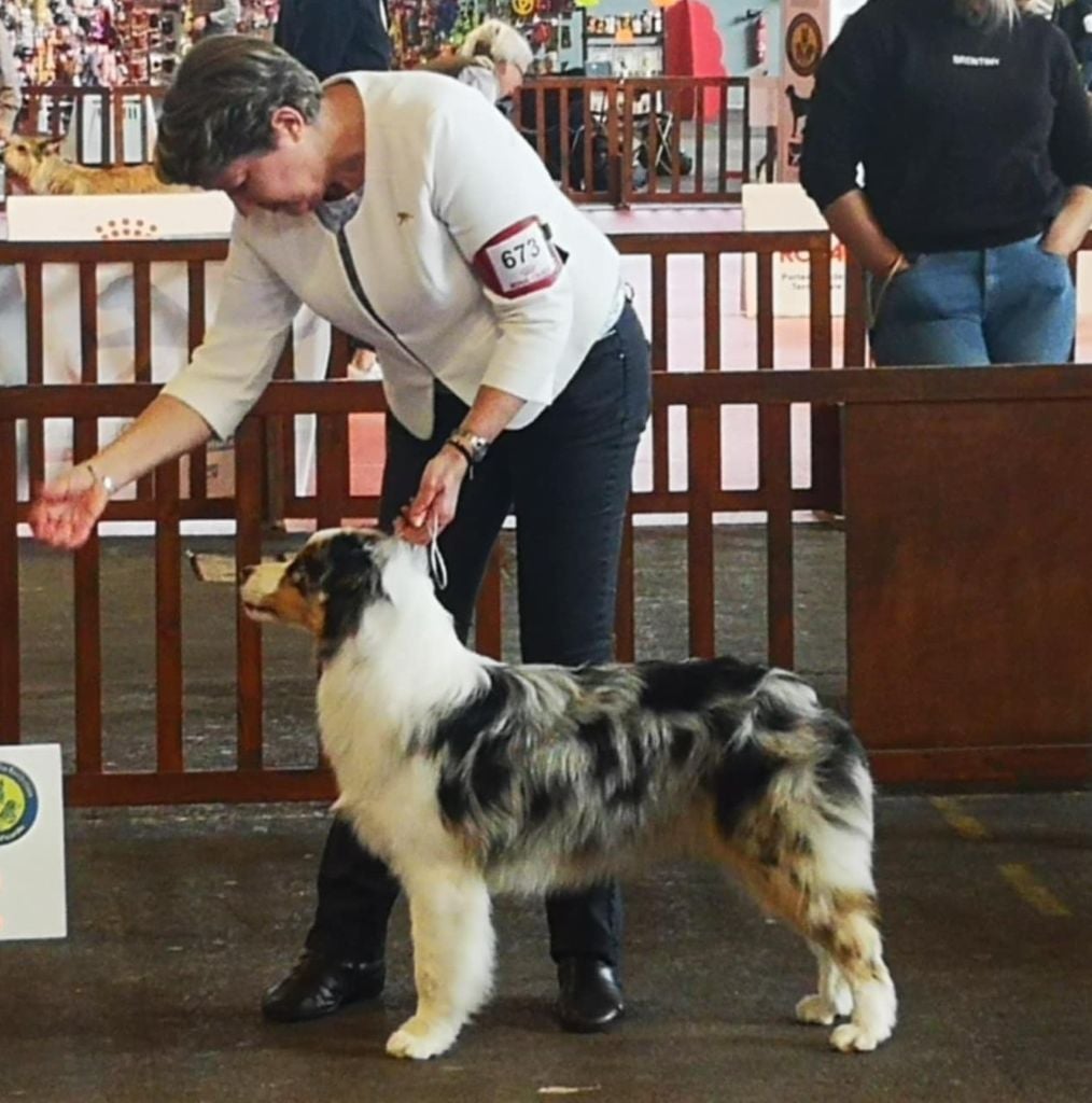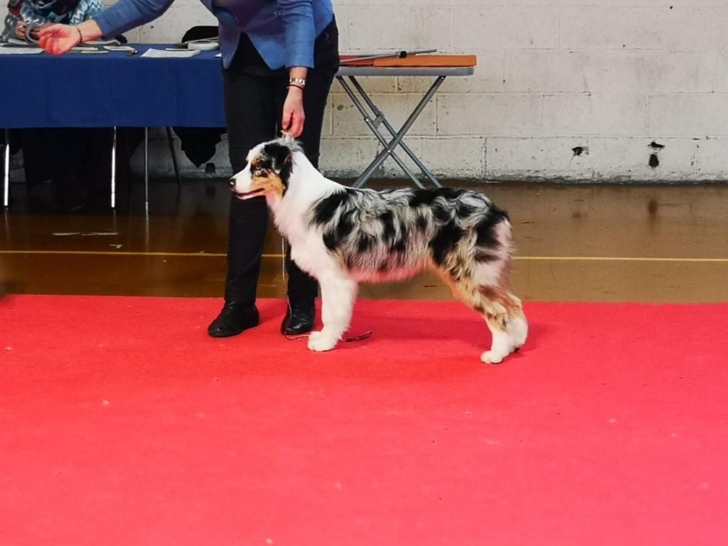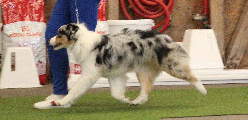 8,5 months - Very athletic elegant well balanced female - absolutly beautiful feminin head and expression - correct bite - exc physical shape - well developed correct body - moderate bone - exc feet - beautiful clear blue merle color - correct coat texture - converges correctly front and rear - good topline for age - exc rich and drive.la juge a ajouté après son classement que chacune des 4 femelles classées aurait mérité la première place.