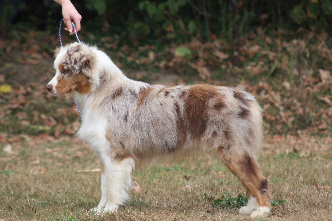 DCC, joli modèle, ligne de dessus encore un peu souple, excellente tête avec un stop bien marqué, excellentes oreilles attache et forme, ossature suffisante, avant main correcte, excellente poitrine pour l'âge, angulation arrière un peu juste, excellente croupe, doit prendre de l'assurance avec l'âge, très bonnes allures