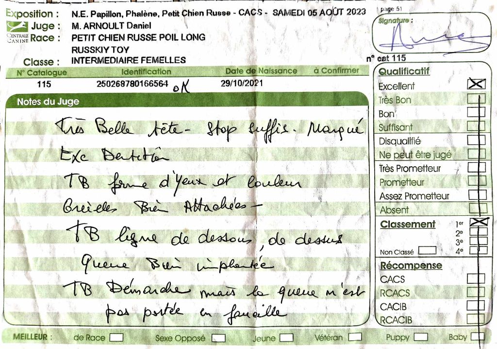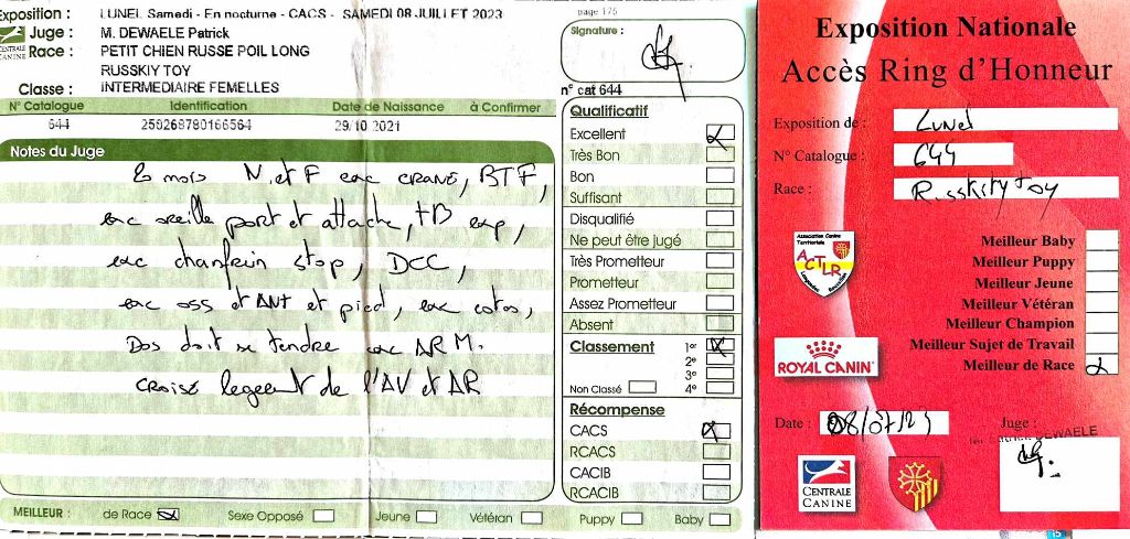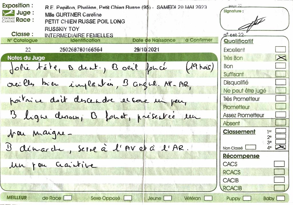 Saskia aurait pu être cotée 3 grâce à ses résultats d'exposition mais suite à sa stérilisation, je n'en ai pas fait la demande : ces sorties resteront de très bons souvenirs.
