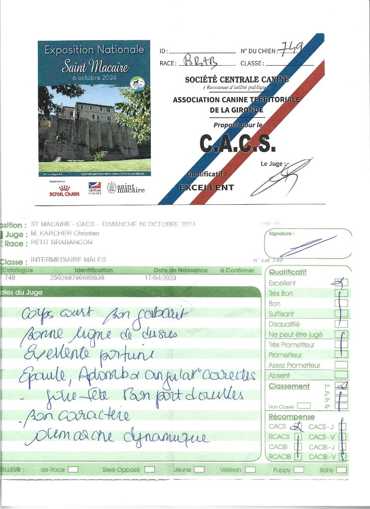 -1er excellent CACS à l'exposition de Saint Macaire(33) le 6/10/2024, jugé par Mr Karcher.