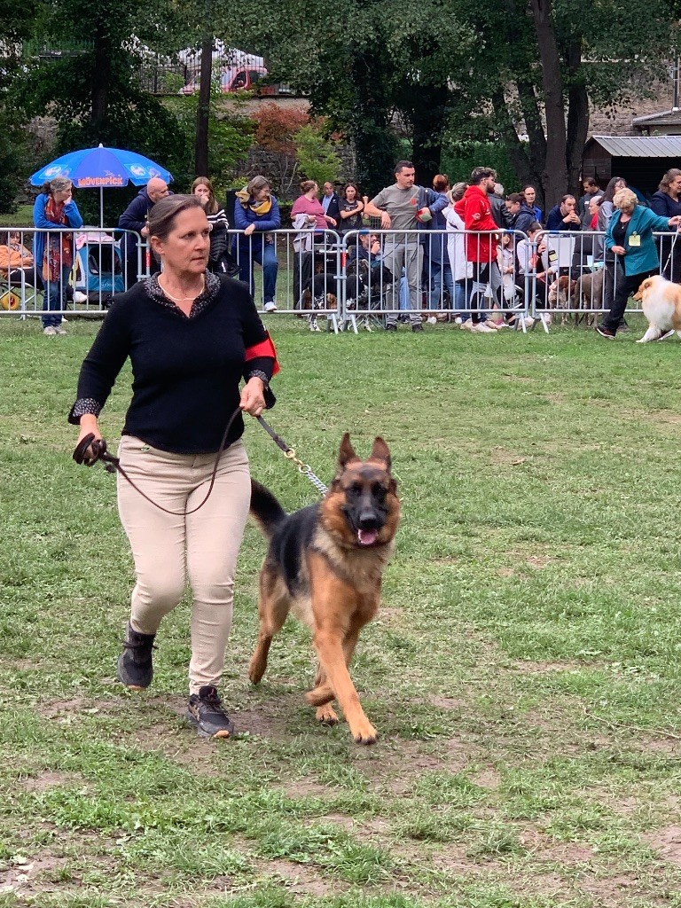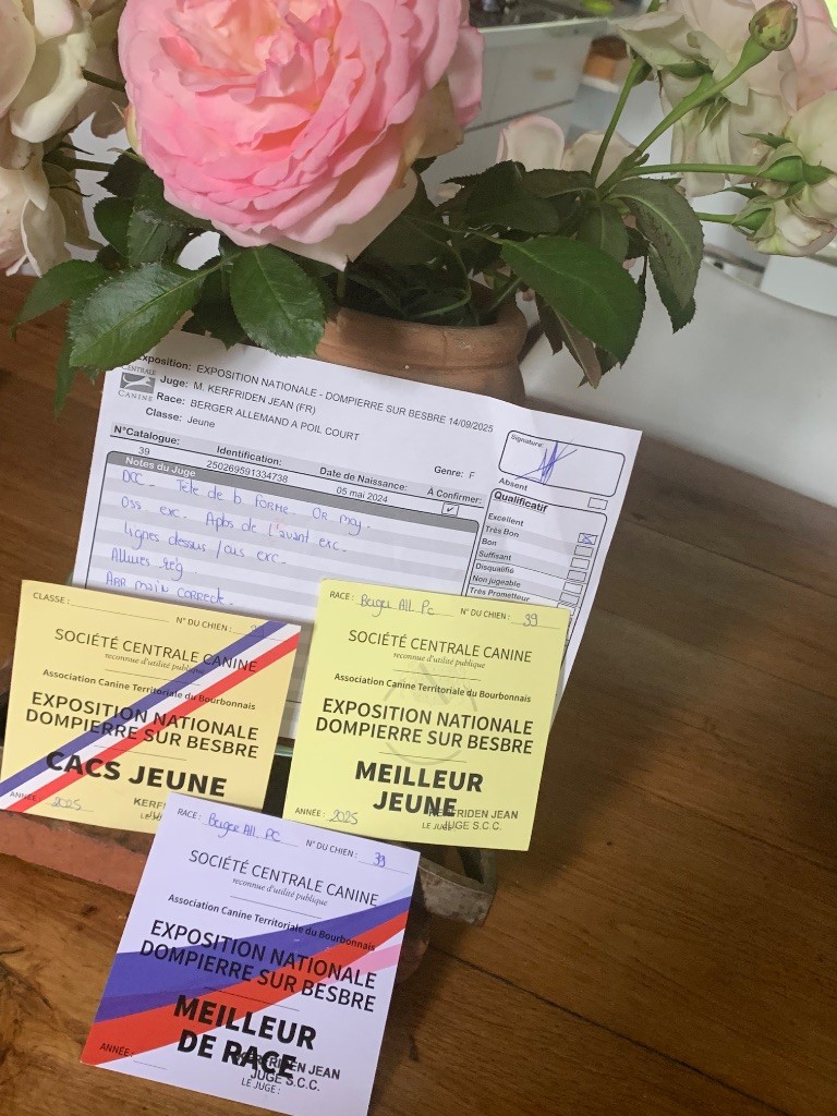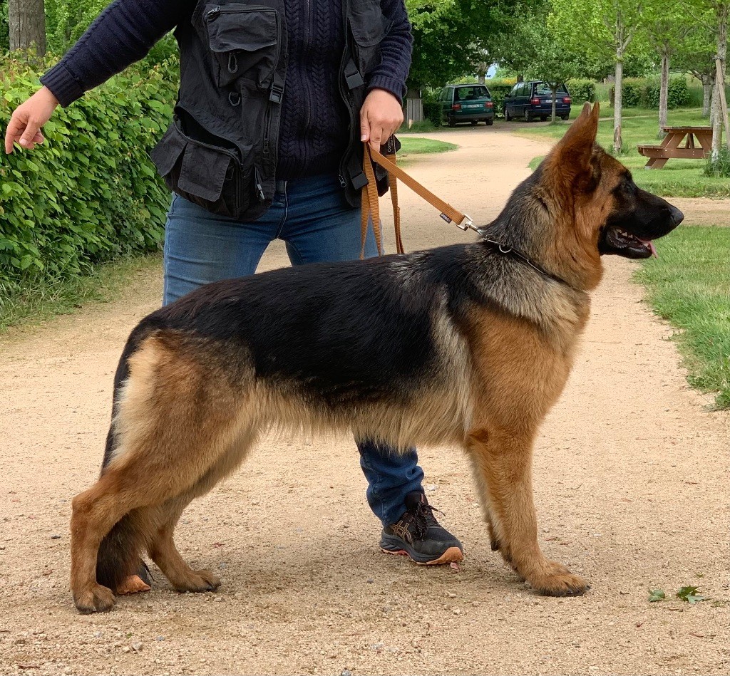 Commentaires du juge : Dentition complète, tête de bonne forme, oreilles moyennes, ossature excellente, aplombs de l?avant excellents, ligne du dessus et du dessous excellente, allures régulières, arrière main correcteUn grand merci M. Kerfriden qui a apprécié (à ma grande satisfaction) à ces mots : « une très belle chienne, bien proportionnée, aux angulations sans exagération, qui a tout ce qu?il faut SANS EXCÈS »