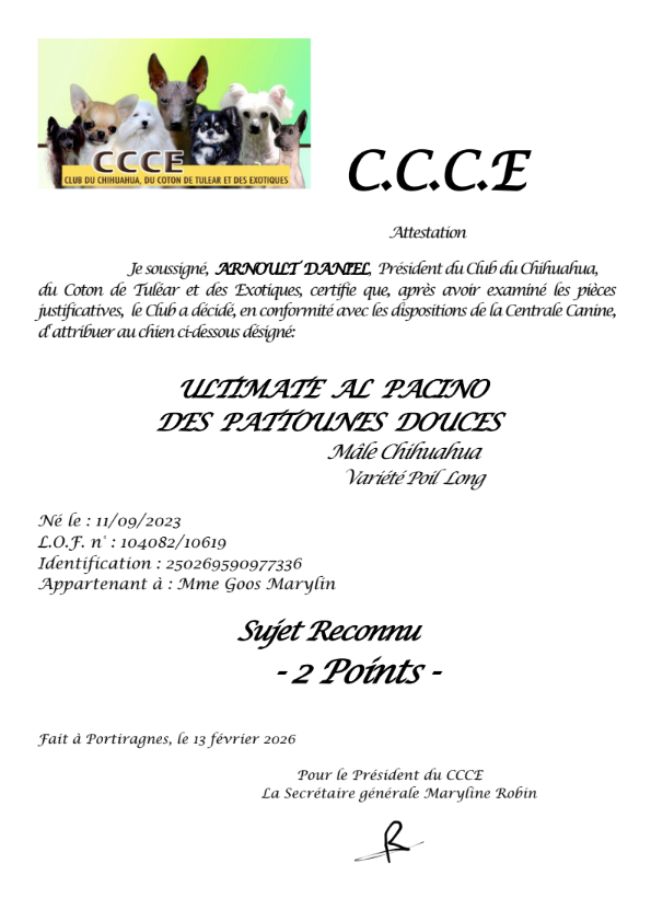 Excellent à la Nationale d'Elevage, titulaire de 2CACS.