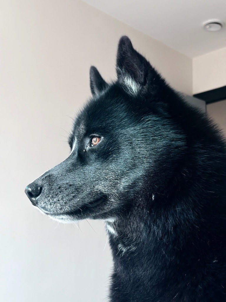 Une petite touche blanche unique, atypique et asymétrique sest invitée sur son museau.