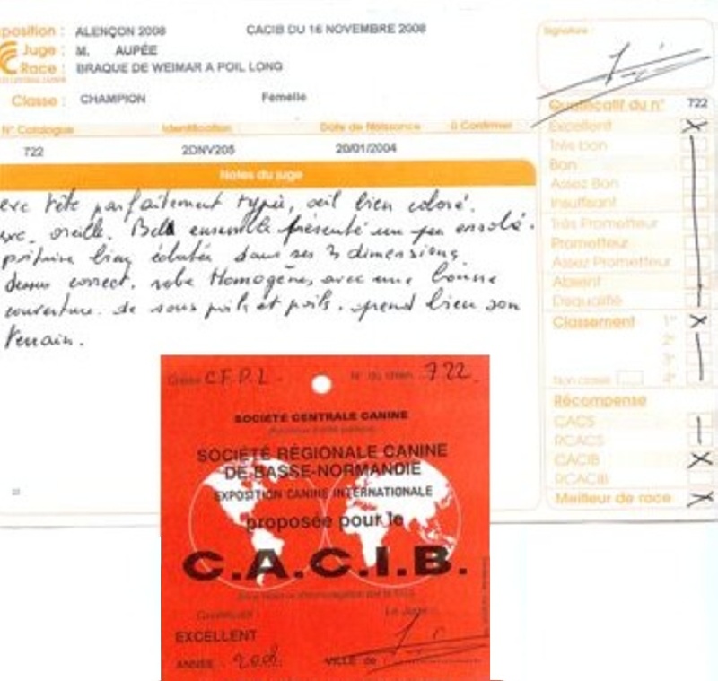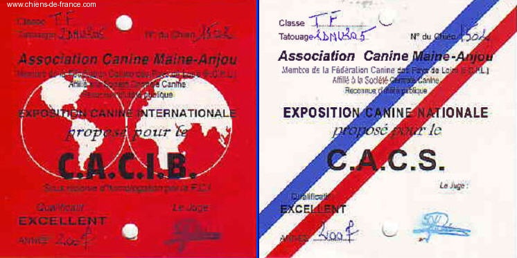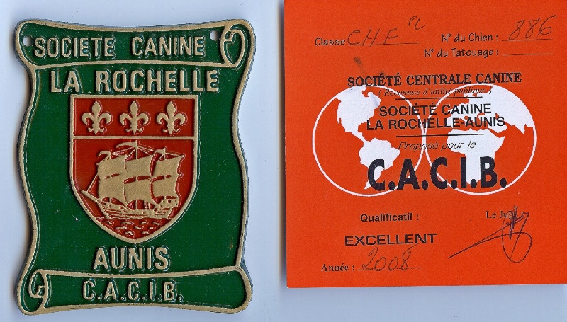 Les résultats suivants donnent droit au CHIB.<p><strong>En Travail</strong><br>T1: FTgtTB1, 08.10.05 Caen (CACT) FR, M. Aupee FR<br><strong>En Beauté</strong><br>B1: CACIB 02.12.06 cat:1677 Rouen FR, J. Goubie FR<br>B2: CACIB 17.12.06 cat:1068 Alençon FR, Mr. Louvet FR<br>B3: CACIB 25.03.07 cat:1502 Angers FR, G. Riva FR<br>B4: CACIB 21.04.07 cat:1060 Châteauroux FR, C. Eymar-D FR<br>B5: CACIB 13.05.07 cat:1381 St Brieuc FR, M. Aupee Fr<br>B6: CACIB 05.06.07 cat:4937 Montluçon FR, J. Guilbert FR<br>B7: CACIB 16.06.07 cat: 838 Salzbourg A, M. Zidar SLO<br>B8: CACIB 25.08.07 cat:1025 Innsbruck A, A. Guiseppe IT<br>B9: CACIB 08.09.07 cat: 755 Pontoise FR, C. Grasset FR<br>B10:CACIB 28.06.08 cat: 886 La Rochelle FR, C. Grasset FR<p>Toutes les conditions sont remplies.<strong> Le titre est homologué par la FCI et la SCC. Voir lettre sous DOCUMENTS</strong><br>