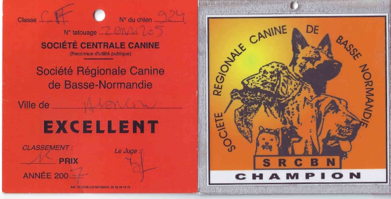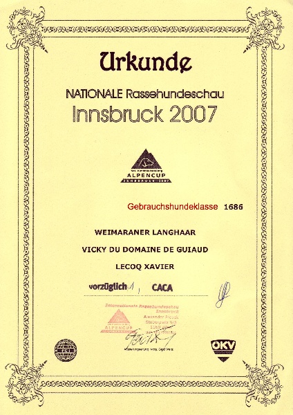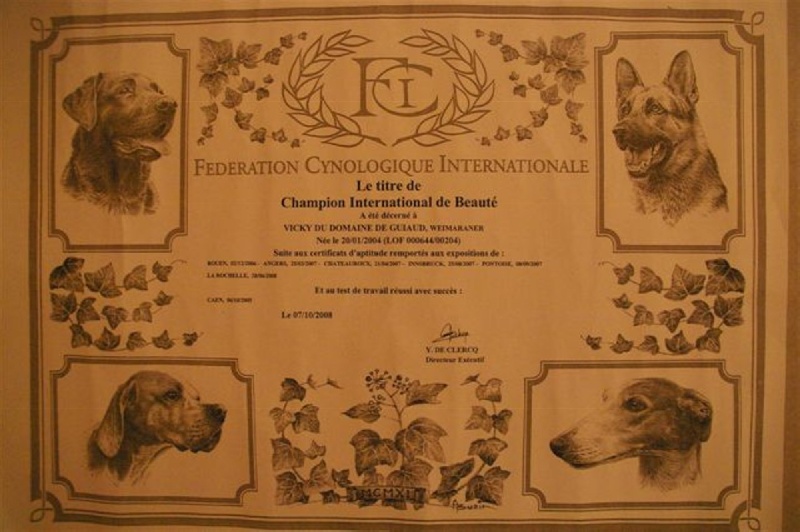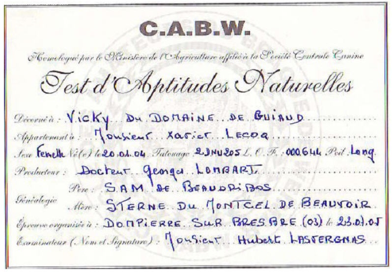 Basé sur le résultat de Field trial du 8 octobre 2005 à Anguerny.<br> Noté Très Bien 1er, jugé par M. Aupée.<br> Le chien susmentionné a passé avec succès toutes les épreuves exigées l'autorisant à s'inscrire dans la classe de chiens d'utilité de toutes les expositions FCI (selon délibération de l'assemblée générale de la FCI à Madrid 1983 ...) <br>Voir original sous Documents.