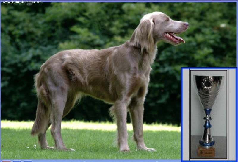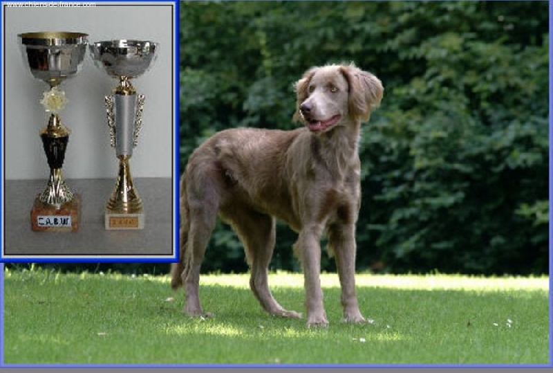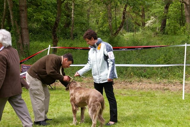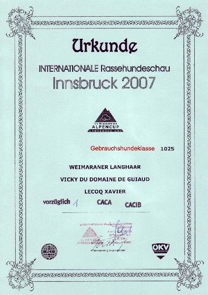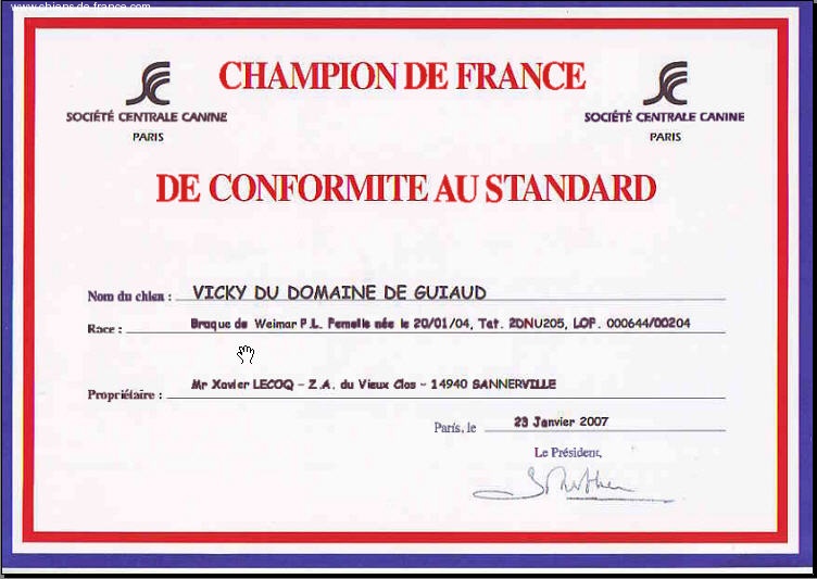 CACIB homologué par la FCI le 12.06.2007.<br>Bien dans le type.<br>Pas en soie.<br>Bon dessus et dessous. <br>Excellente poitrine. <br>Fouet bien attaché avec une arrière -main anguleuse. <br>Un peu juste en encolure. <br>Belle tête bien proportionnée, suffisamment ciselée.<br>Oeil expressif.<br> S'avère libre dans le mouvement. <br>Avec le CACS de Championnat, le CACS de Rouen, ce CACS de Spéciale, son TB1 en Field d'automne et la dysplasie acceptée, Vicky devient:<p> <strong> Championne de France de Conformité au Standard. </strong> <p> Homologation par la SCC le 23. janvier 2007